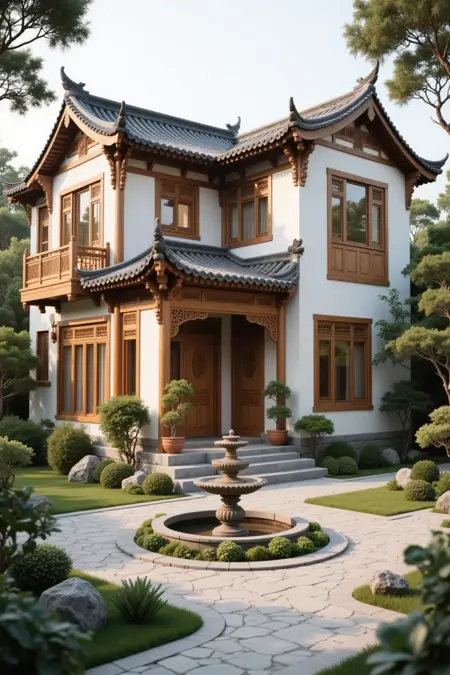 中国伝統的建築スタイル、庭と一体化した家、月の門、塔型の屋根の角、牡丹の茂み、せせらぎする噴水。