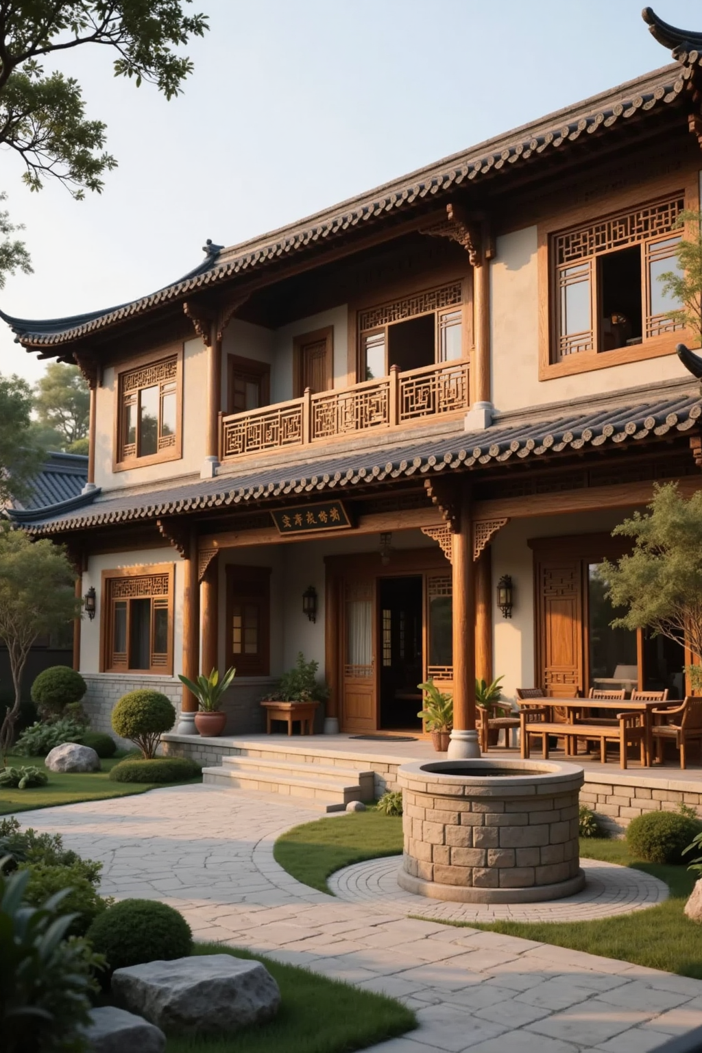 中国伝統的建築スタイル、田舎の屋敷、土色の木材、わら葺き風の屋根のアクセント、近くに野菜畑、素朴な石井戸。