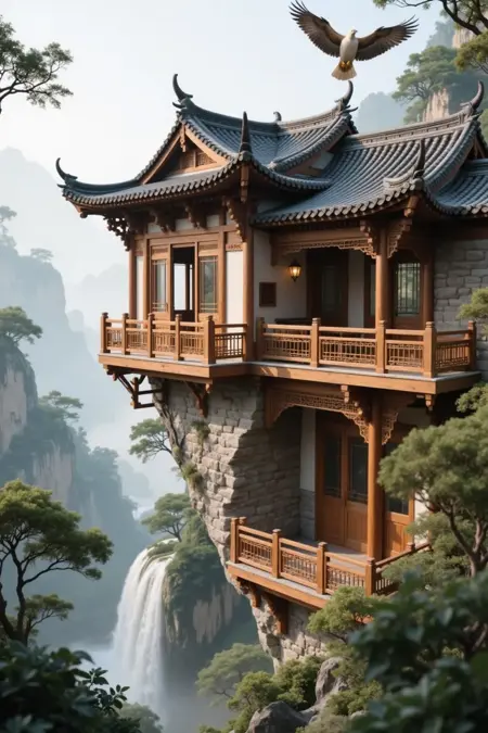 中国伝統的建築スタイル、崖の上の住居、頑丈な木製の支え、突き出た屋根の軒、下には滝、空を舞う鷲。