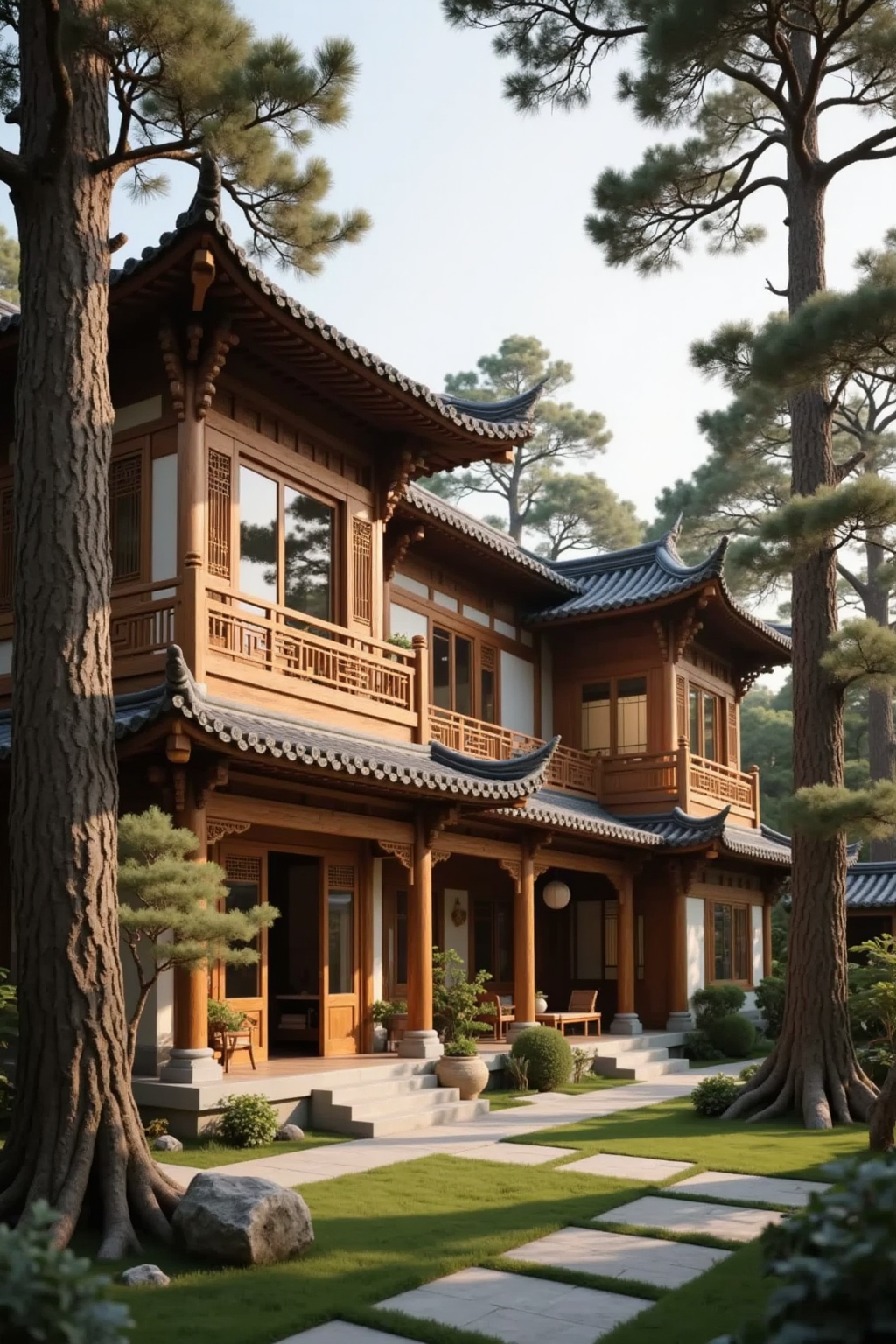 中国伝統的建築スタイル、森に隠れた家、自然な木の仕上げ、簡潔な屋根ライン、高いヒノキの木、静かな苔むした庭。