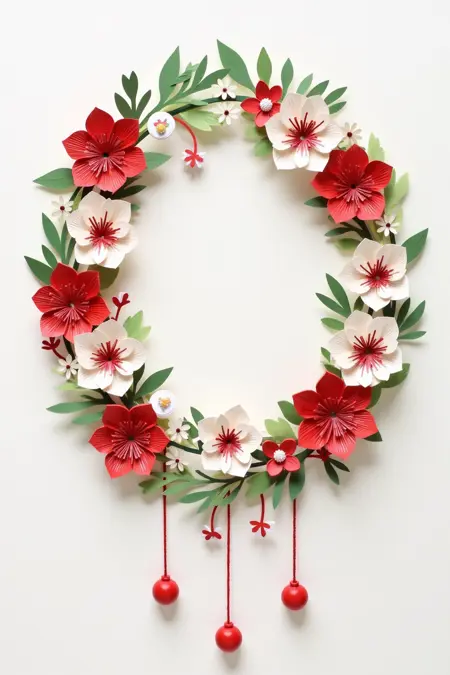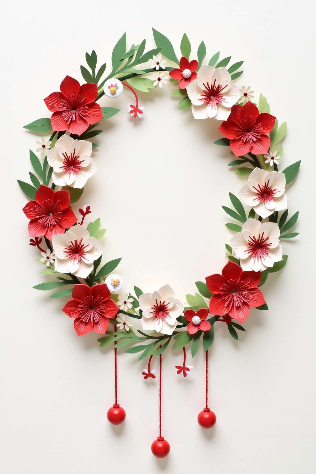 4. 紙切り花の装飾、円形のフレーム、赤と白の花の混合、緑の葉っぱ、丸い果実のペンダント。
