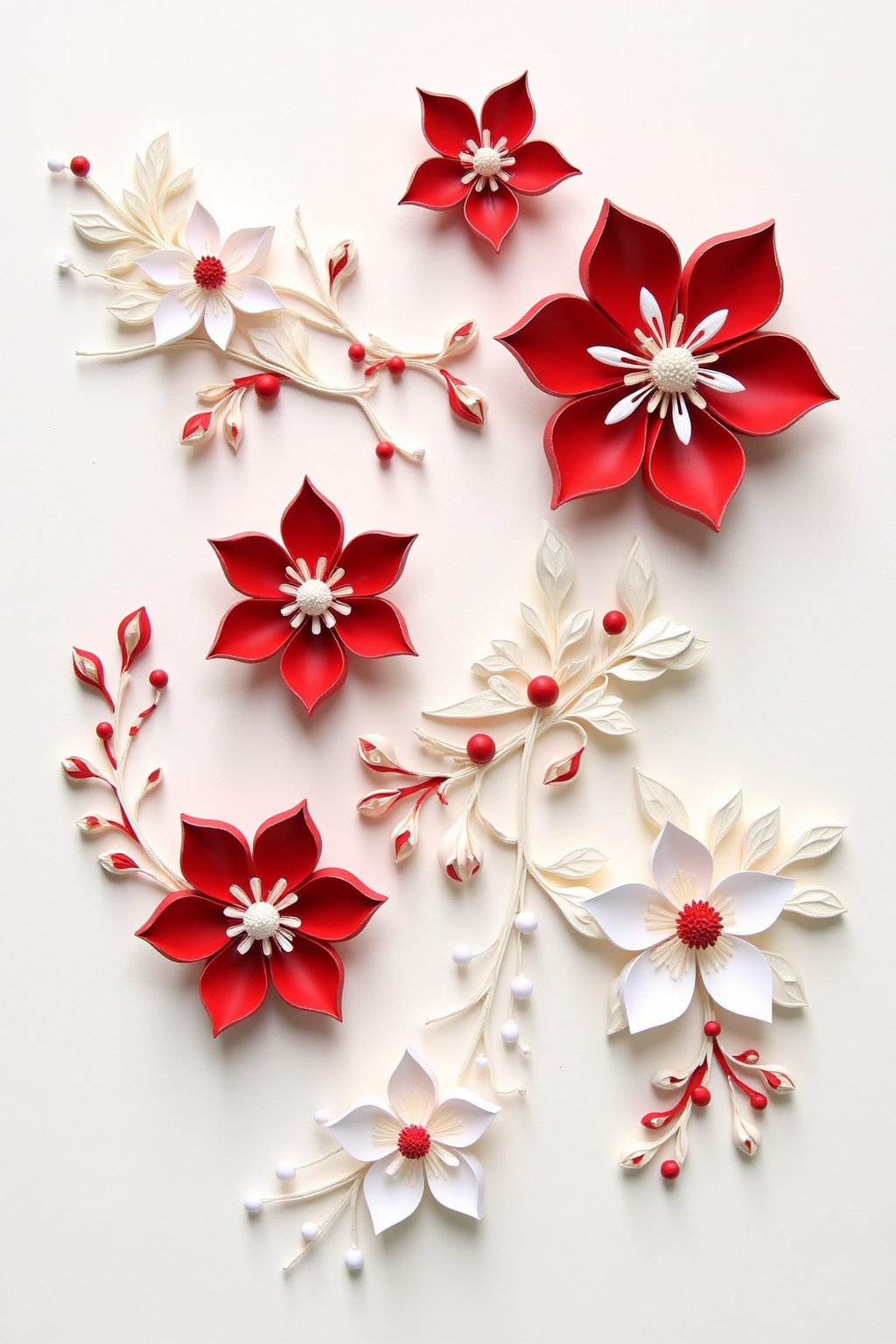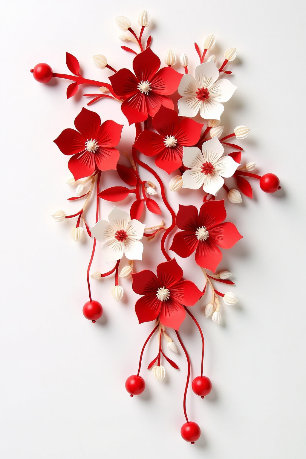 1. 紙切り花の装飾、赤と白のトーン、3Dのような層状デザイン、小さな吊りビーズ、ミニマリストな背景。