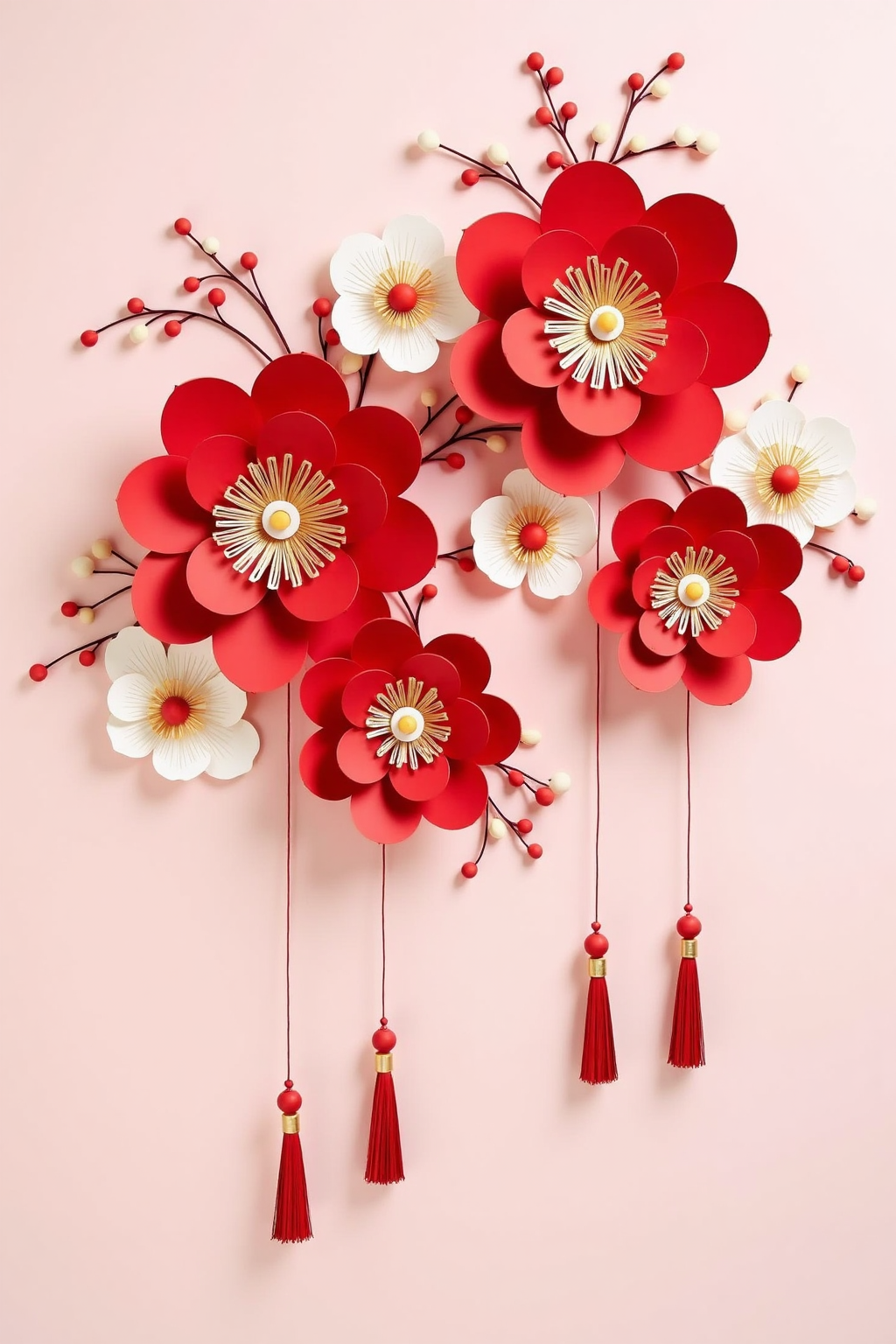 3. 紙切り花の装飾、大きな赤い花びら、小さな白い花と組み合わせ、長いタッセルのような要素、柔らかい色の背景。