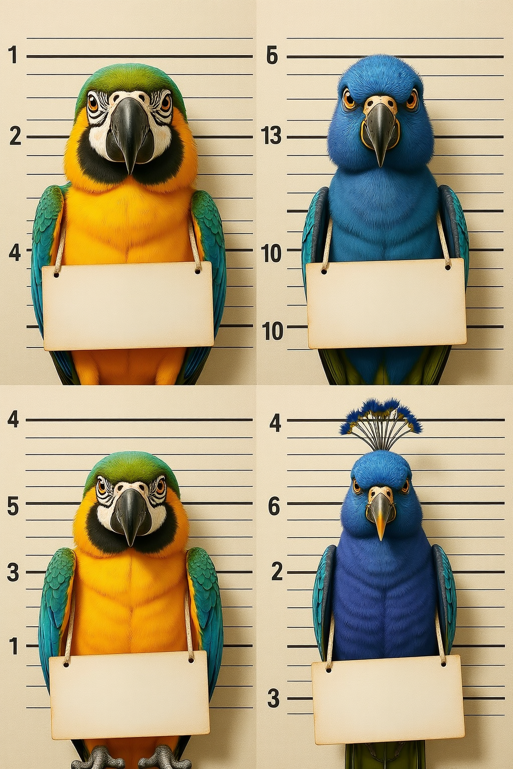 이름표가 있는 동물 신분증 사진, 앵무새와 공작 같은 이국적인 조류, 화려한 깃털, 화창한 배경, 활기찬 분위기.