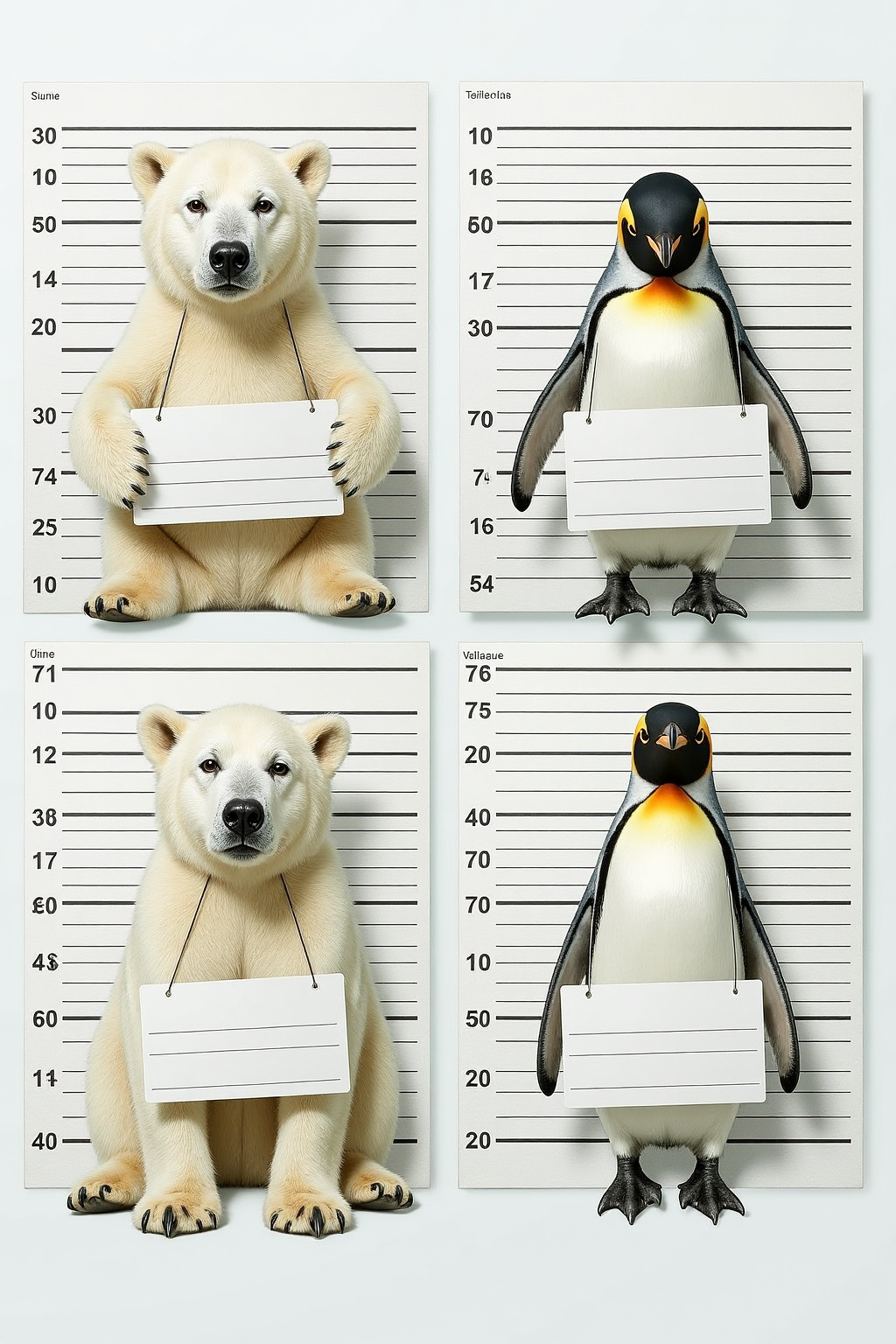 이름표가 있는 동물 신분증 사진, 북극곰과 펭귄 같은 극지방 동물, 흰색 얼음 톤, 차가운 조명, 강인한 표정.
