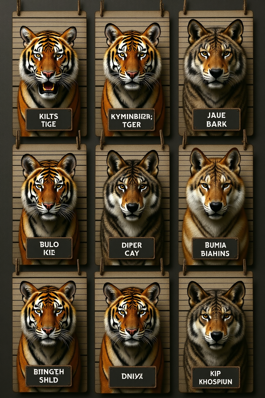 이름표가 있는 동물 신분증 사진, 호랑이와 늑대 같은 야생 동물, 어두운 극적인 조명, 거친 질감, 사나운 표정.