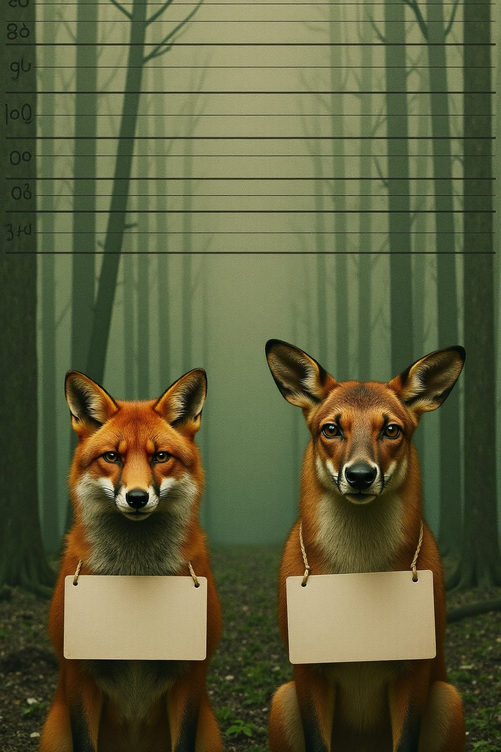 이름표가 있는 동물 신분증 사진, 여우와 사슴 같은 산림 동물, 녹색 숲색조, 안개 낀 배경, 신비로운 분위기.