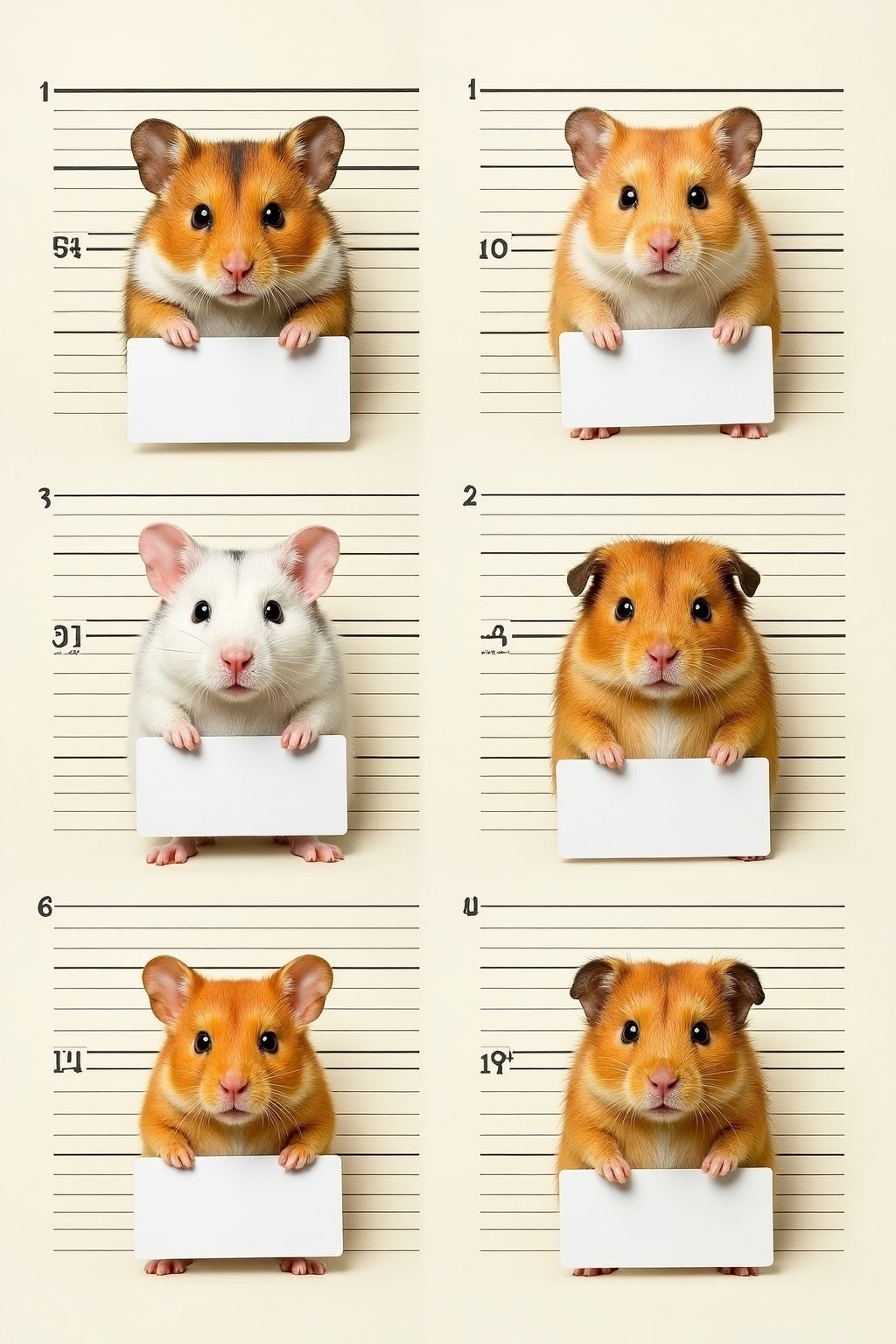 이름표가 있는 동물 신분증 사진, 햄스터와 기니피그 같은 작은 애완동물, 밝고 즐거운 색조, 장난스러운 자세, 귀여운 디테일.