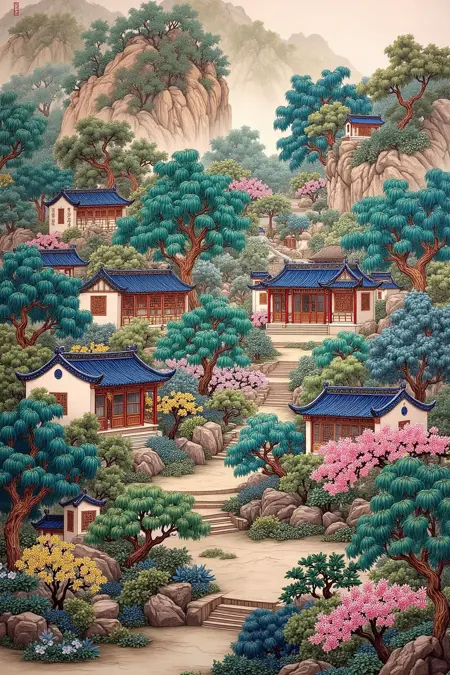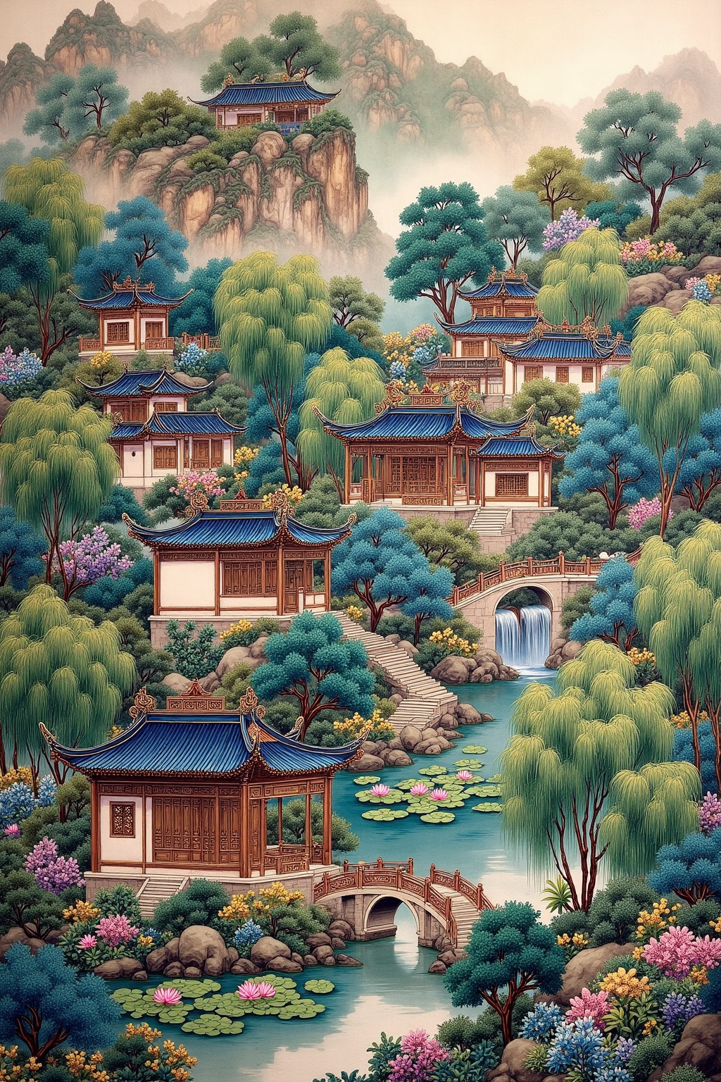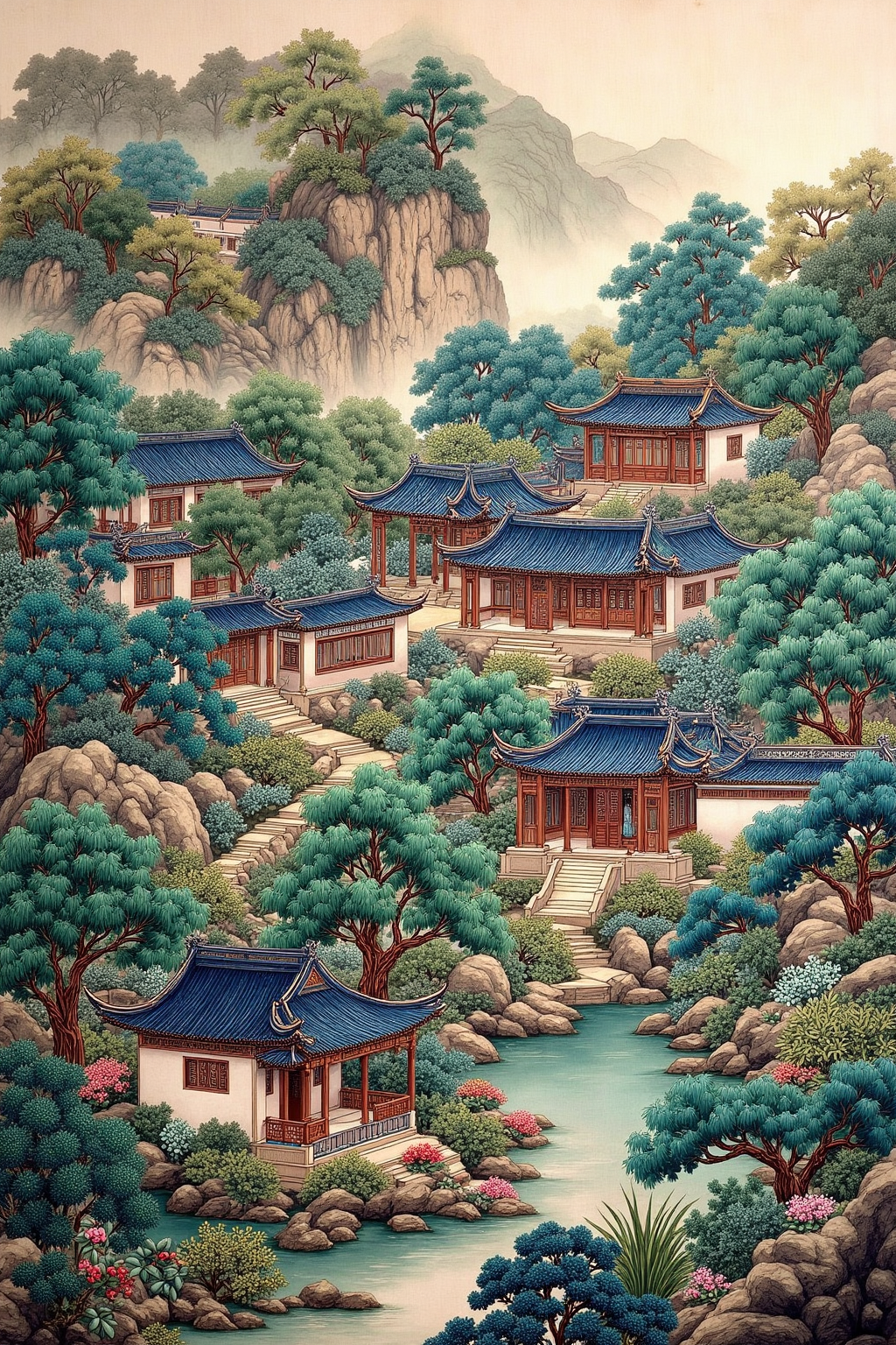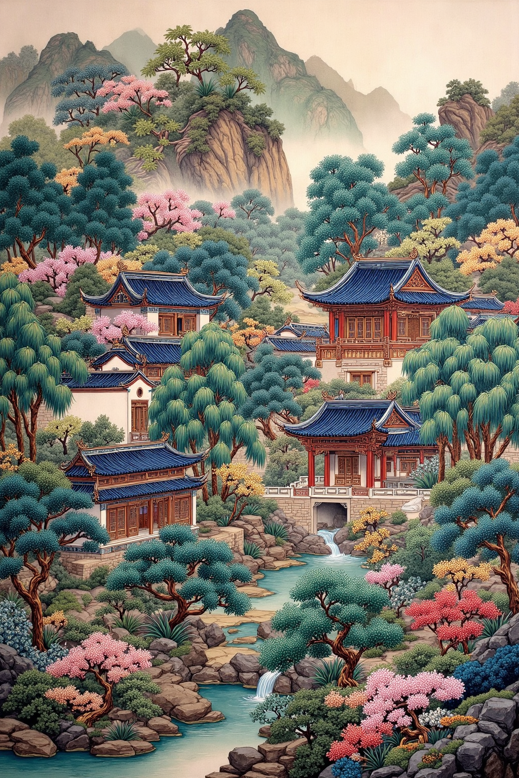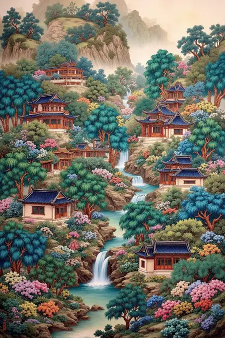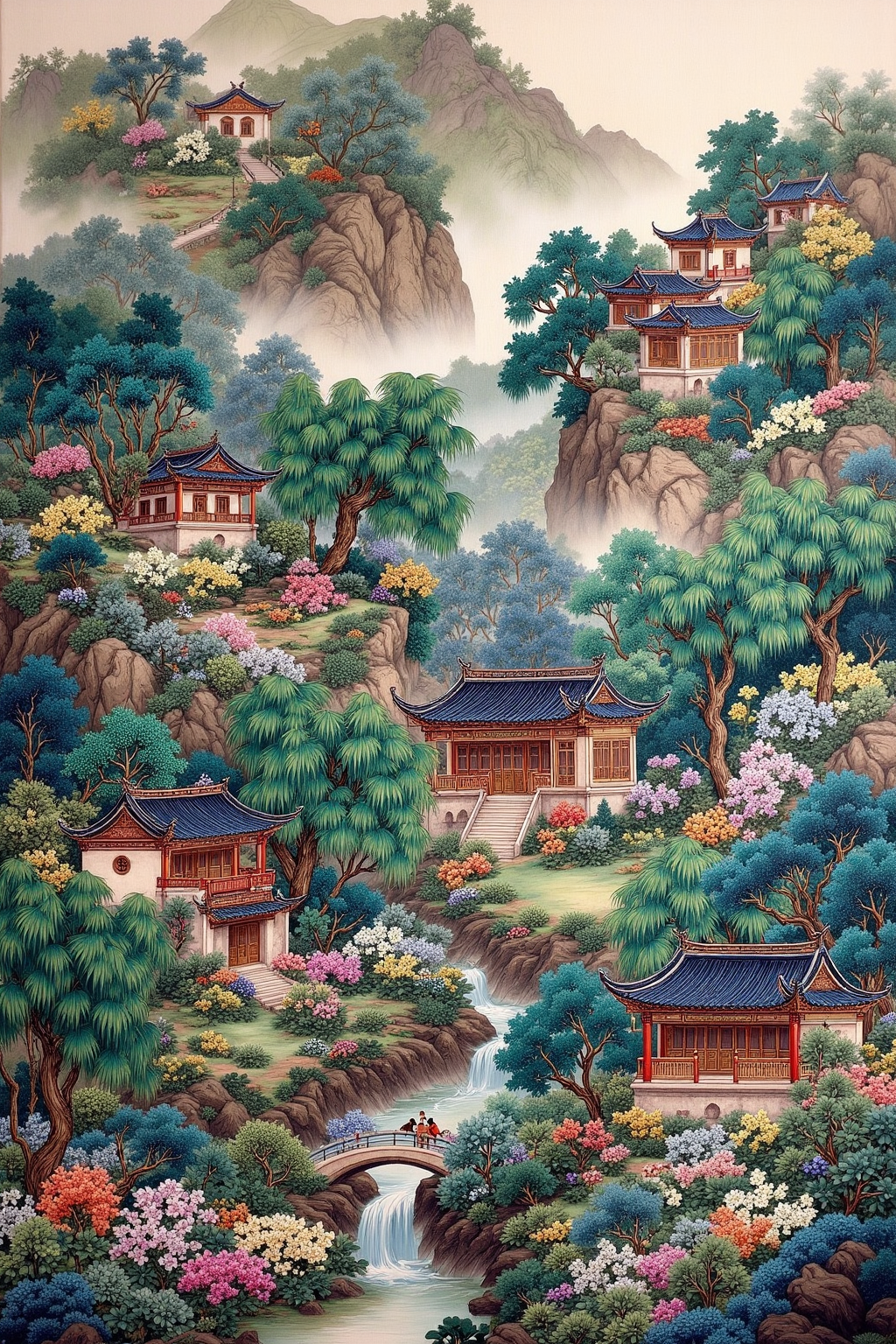 2. 전통 중국 정원 풍경화, 우아한 건축물, 층층이 쌓인 산, 맑은 계곡, 피어난 꽃들로 시적인 매력을 가득 담으세요.
