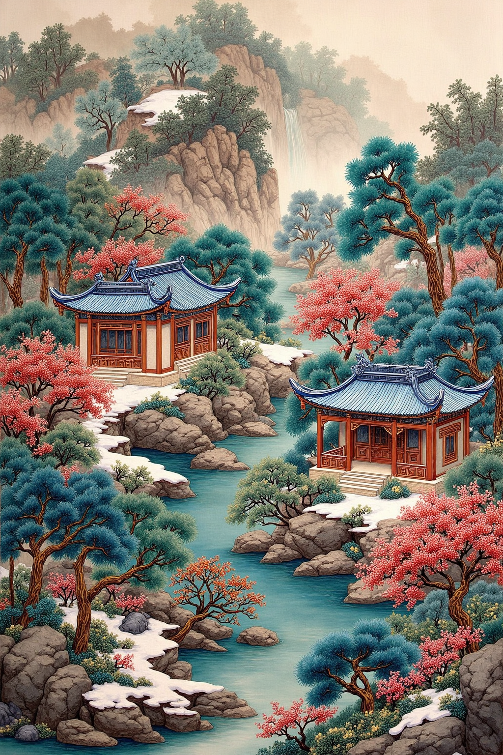10. 전통 중국 정원 풍경화, 눈 덮인 누각, 얼어붙은 강, 상록수, 붉은 매화로 겨울의 우아함을 강조하세요.
