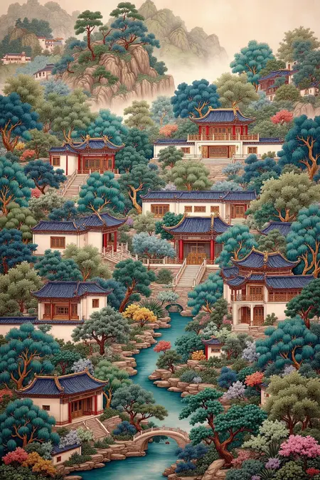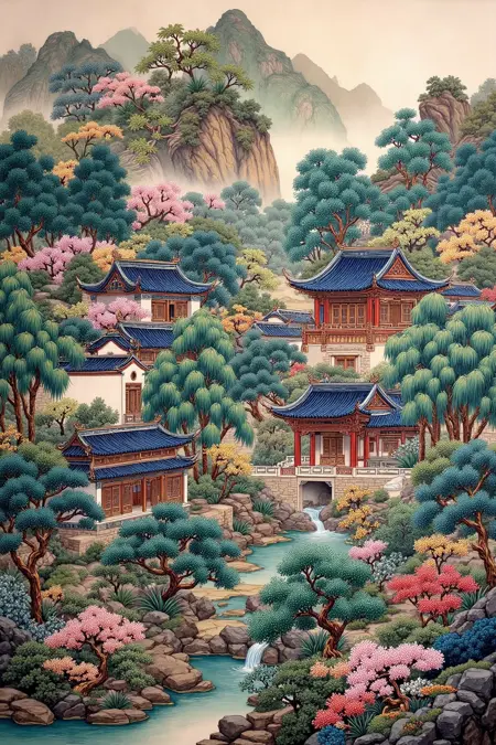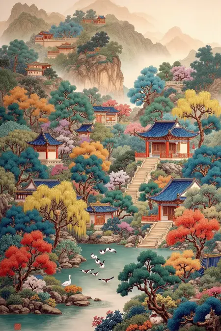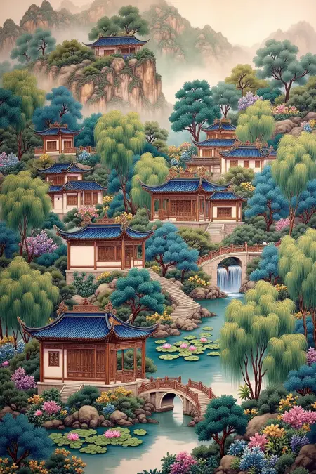 1. 전통 중국 정원 풍경화, 화려한 색상, 정교한 누각, 굽이치는 강, 무성한 꽃들로 고요한 고대 풍경을 연출하세요.