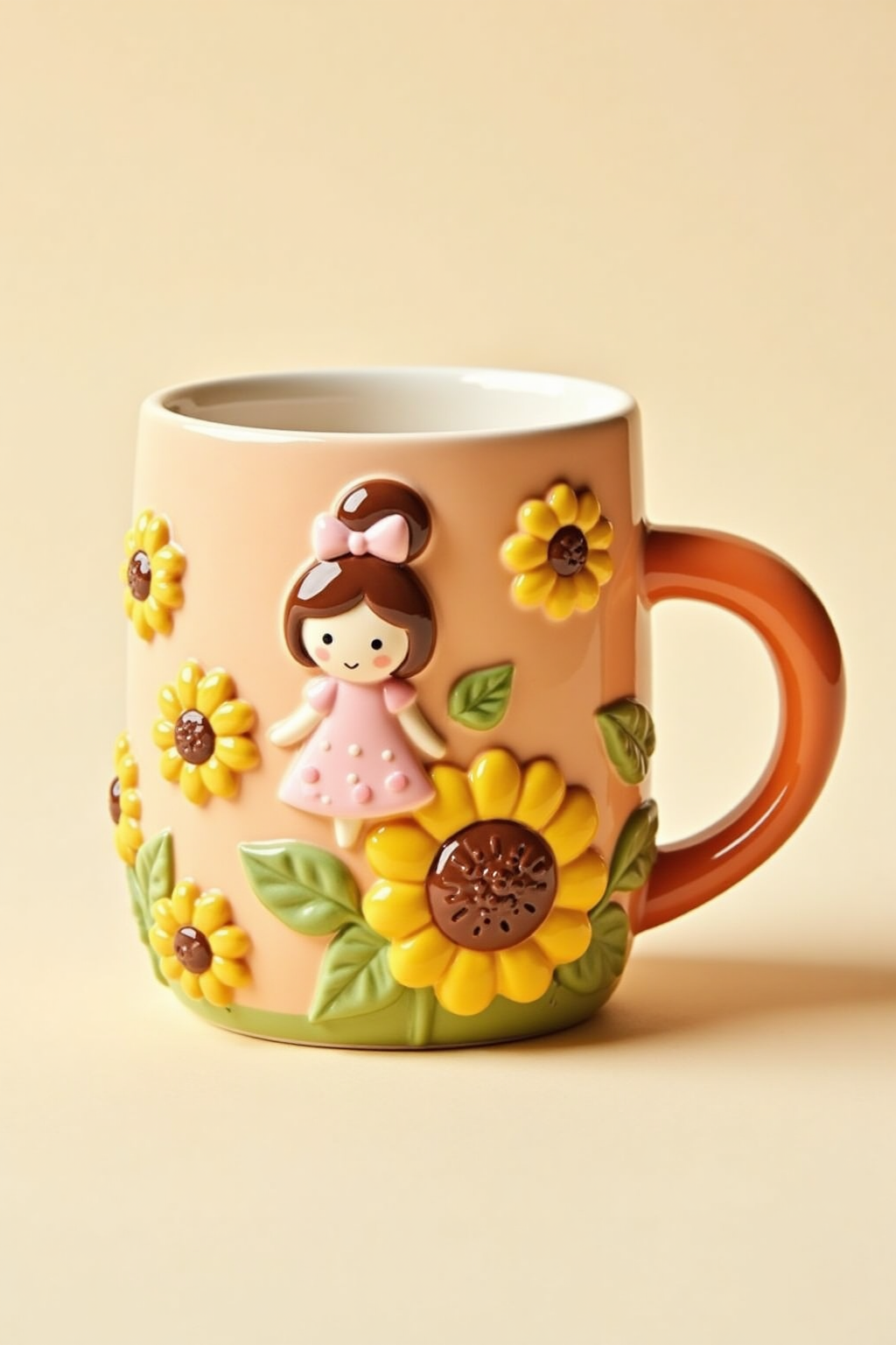 3D - embossed cartoon patterns, sunflower - adorned mug, girl - like shape, warm colors, lively design.
