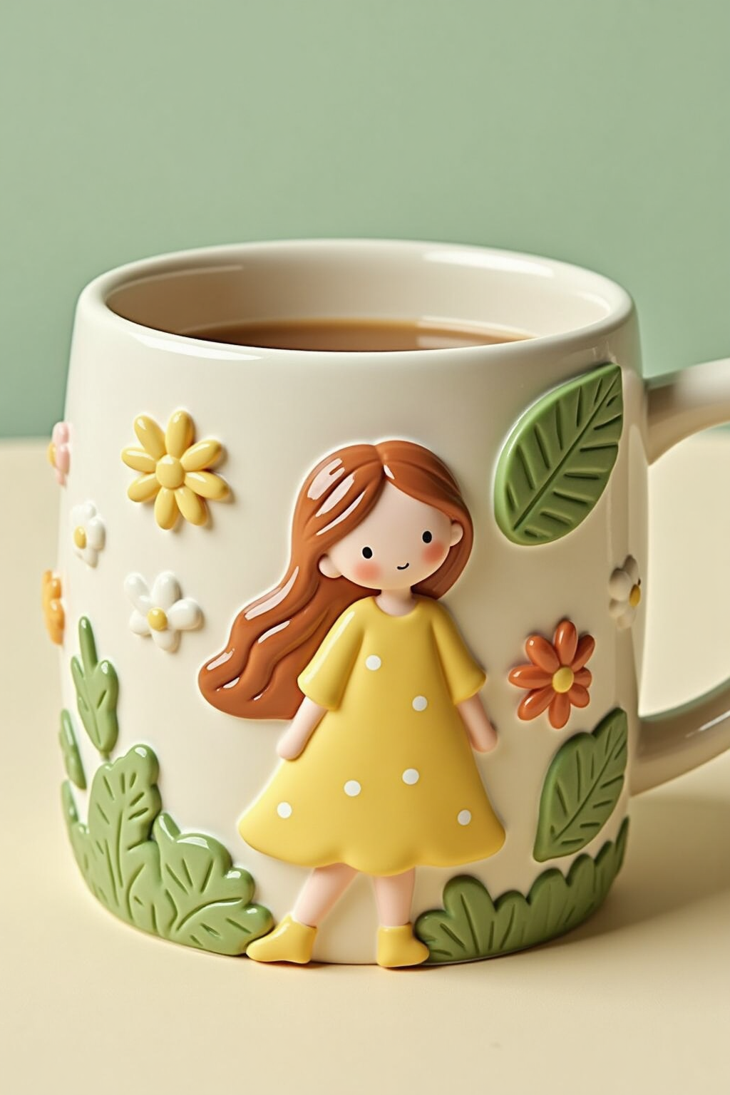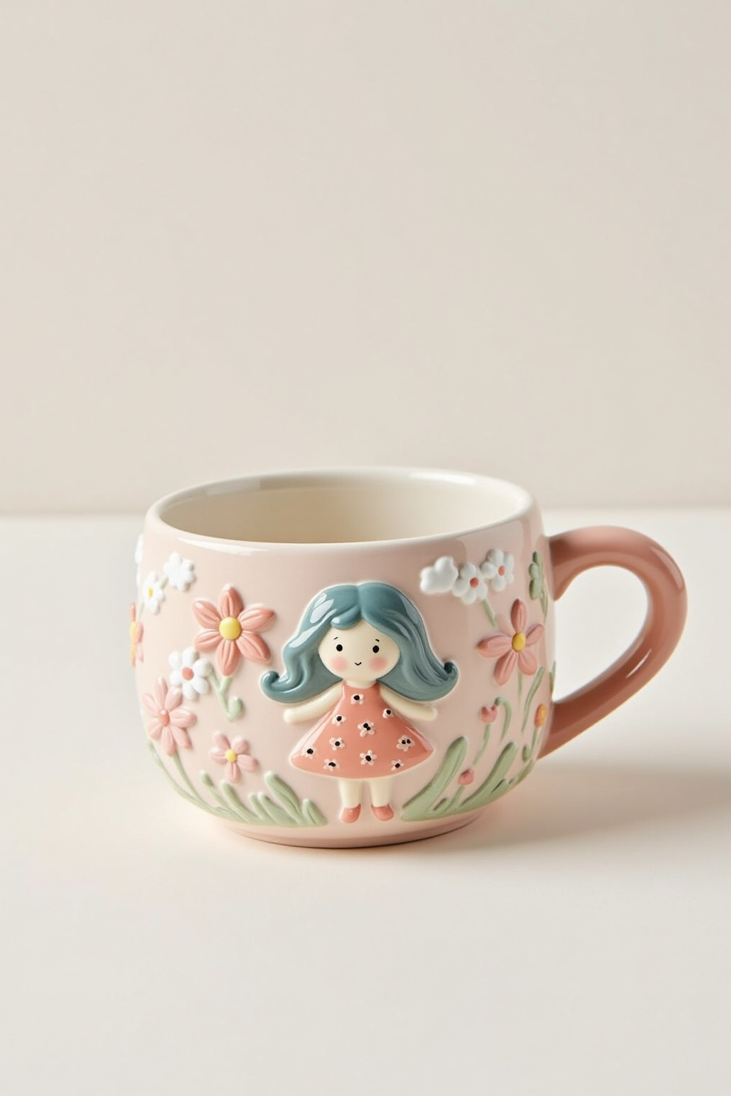 3D - embossed cartoon patterns, cute girl with flowing hair and floral dress, delicate flowers around, ceramic mug, soft colors.