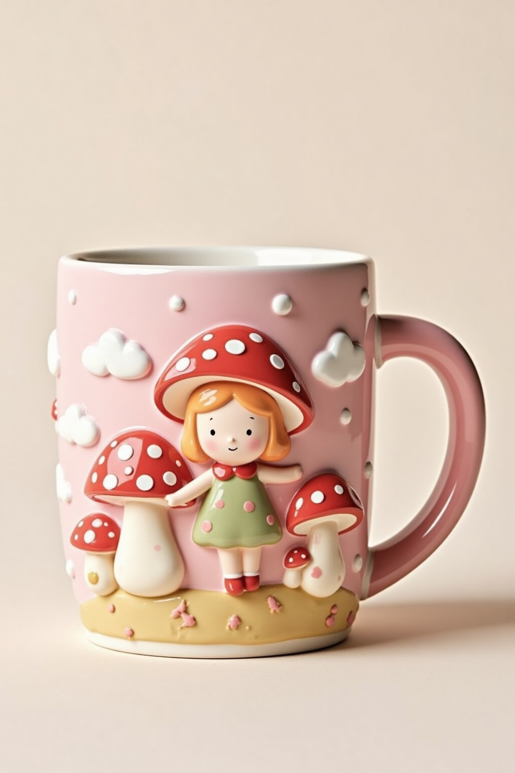 3D - embossed cartoon patterns, girl with mushrooms and red caps, pink background, whimsical scene, mug shape.