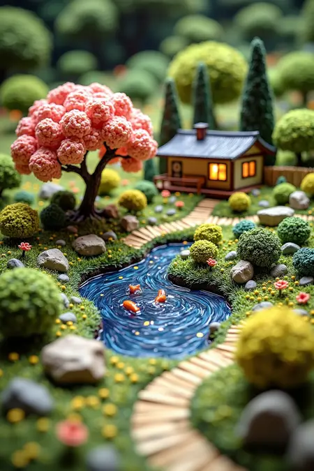 9. ミニチュア風景モデル、日本の庭園を制作:禅の石、桜の木、錦鯉の池、竹の塀で囲まれた茶室。