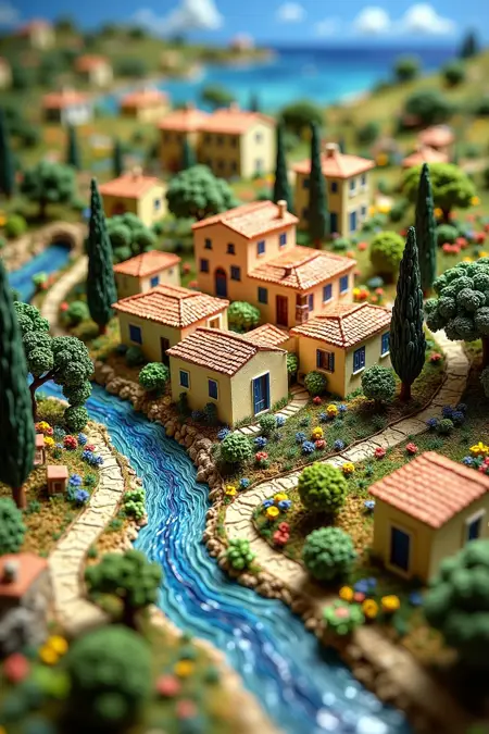 2. ミニチュア風景モデル、地中海スタイルのシーンを構築:テラコッタ屋根、オリーブの木、曲がりくねった石の道、ターコイズ色の海。