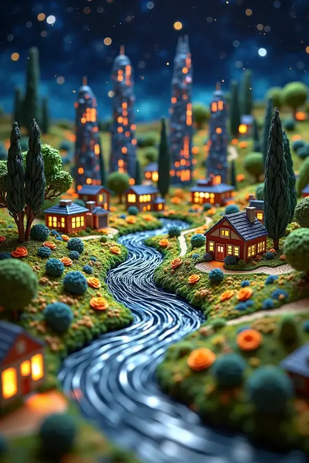 ミニチュア風景モデル、ヴァン・ゴッホの『星月夜』を再現:渦巻く空、村の灯り、質感ある川を描き、絵画と3Dアートを融合させる。