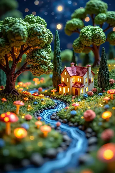 1. ミニチュア風景モデル、ヴァン・ゴッホの『星月夜』を再現:渦巻く空、村の灯り、質感ある川を描き、絵画と3Dアートを融合させる。