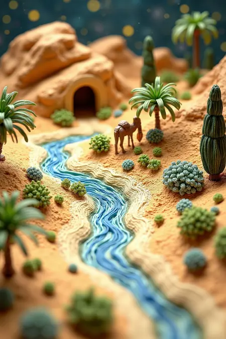 8. ミニチュア風景モデル、砂漠のオアシスをデザイン:砂丘、ヤシの木、ターコイズ色の泉、ラクダの形をした岩の形成。