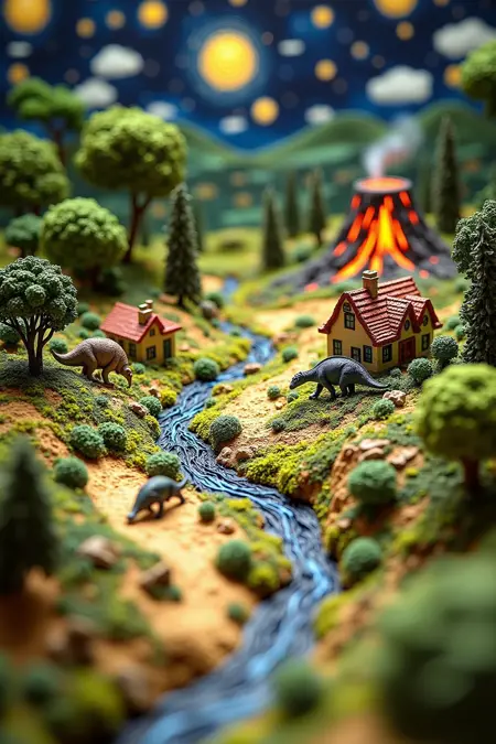 10. ミニチュア風景モデル、史前風景を構築:恐竜が徘徊する谷、噴火する火山、シダの森、蒸気を上げるタール池。