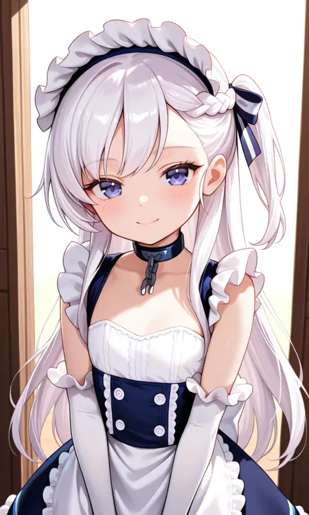 年龄变小,小乳房,女仆头饰,蓝色项圈,蓝色丝带,荷叶边,女仆,无袖,白色围裙,腰围围裙,白手套,肘部手套