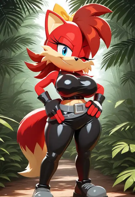 Fiona Fox, red fur, yellow muzzle, blue eyes, brown hair, yellow hairbow, black crop top, gray belt, black pants, black shoes