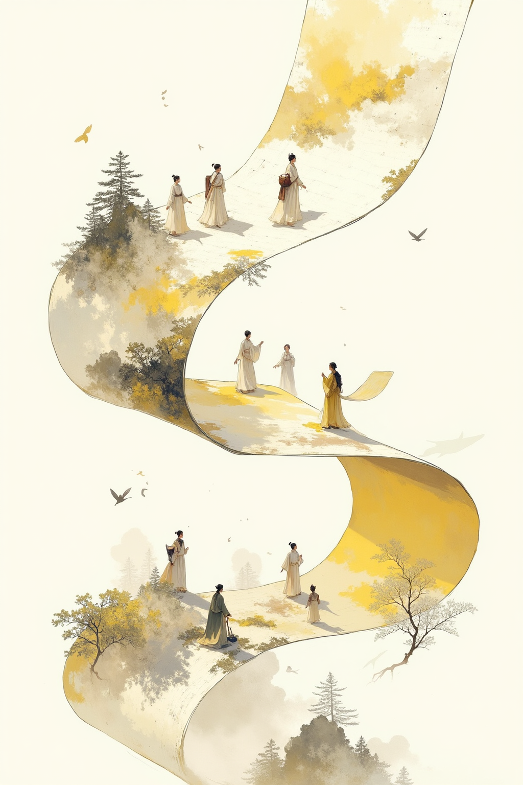 인물과 풍경이 있는 잉크 수묵 권말, 구불구불한 배치, 구름이 휘몰아치고, 여행객들이 멈춰 서 있는 장면, 따뜻한 노란 톤, 향수 어린 분위기.