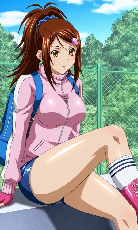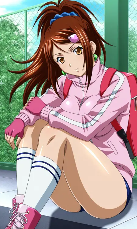 巴乔·穆基(《一骑当千》全系列),长发,棕色头发,马尾,发圈,发夹,侧发,分刘海,棕色眼睛,勾玉耳环,单耳环,中等胸部,大腿,长袖,粉色夹克,运动夹克,高领,粉色手套,露指手套,背包,蓝色袜子,过膝袜,粉色鞋子,高帮鞋