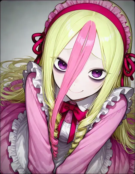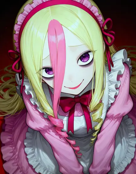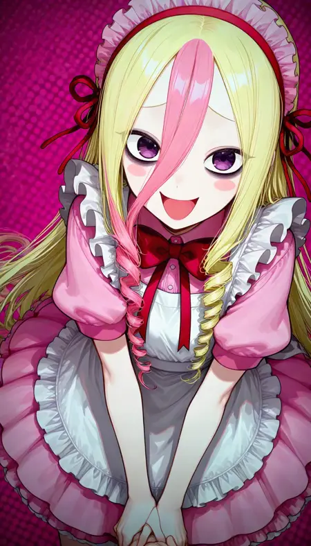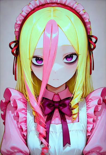 long hair, blonde hair, 1other, multicolored hair, pink hair, dress, frills, pink dress, apron, red ribbon, purple eyes, bags under eyes, maid headdress, two-tone hair, bow, streaked hair
