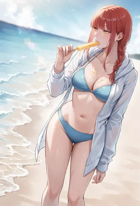 水着の服装: 胸、中程度の胸、水着、ビキニ、青いビキニ、オープンな服、オープンなフーディー、フード、フーディー、オープンなジャケット、ジャケット、白いジャケット、長袖、別の衣装