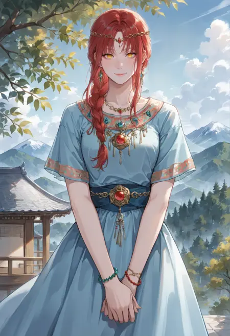 外見: 1人の女の子、輪のついた目、黄色い目、赤髪、長い髪、中途半端な長さの髪、前髪、編み込み、片側の編み込み、編み込みポニーテール、横髪