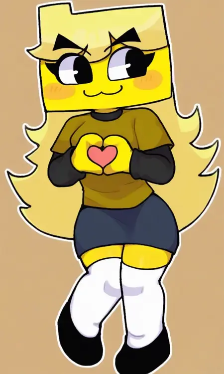 | 训练词汇 | Meri FNF,1girl,yellow skin,flat rectangular head,long hair, blonde hair,black eyes,shirt,brown shirt, miniskirt, black footwear,layered sleeves, short over long sleeves,black sleeves,long hair,white thighhighs,blue skirt,shoes,black footwear,colored skin,:3已复制! |