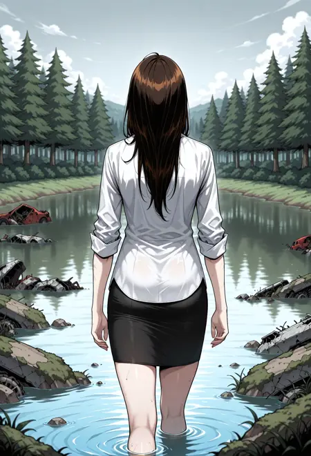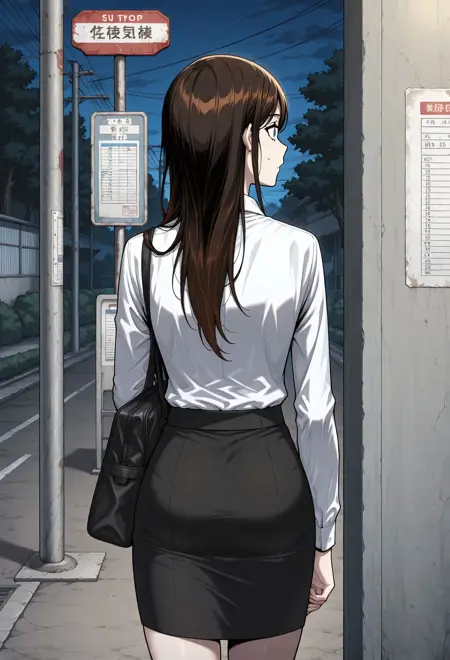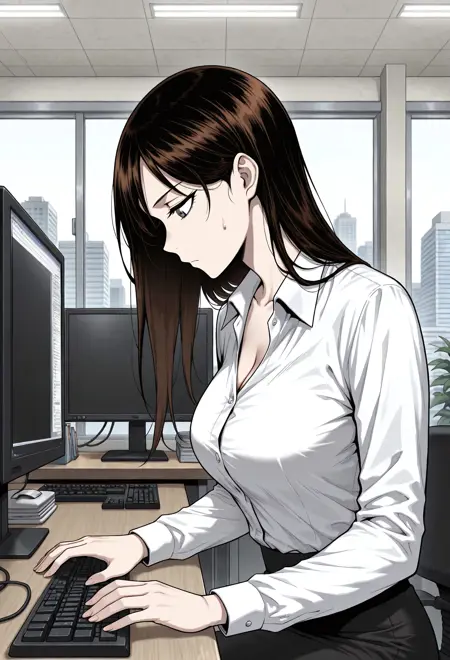 ma1n_s30ng_j1_3un, 1girl, solo, 갈색 머리, 긴 머리, 앞머리, 눈 사이의 머리, 회색 눈, 쇄골, 가슴선, 중간 크기의 가슴, 오피스 레이디, 흰 셔츠, 컬러드 셔츠, 드레스 셔츠, 부분적으로 단추 풀림, 셔츠 안에 넣음, 긴 소매, 검은 치마, 연필 치마