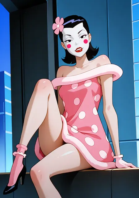 pink polka dot dress, bare shoulders, gloves, hair ornament, hair flower, gloves, black heels, pink socks