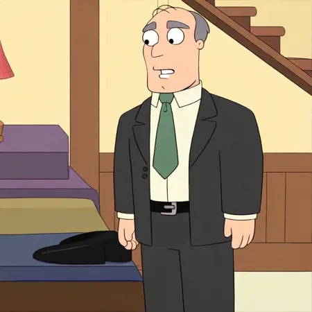 DReynolds, 남성, 성숙한 남성, 나이 많은 남성, 회색 머리카락, 회색 눈썹, 검은 눈, 둥근 귀, 검은 정장, 흰색 칼라 셔츠, 녹색 넥타이, 검은 벨트, 검은 정장 바지, 검은 구두,