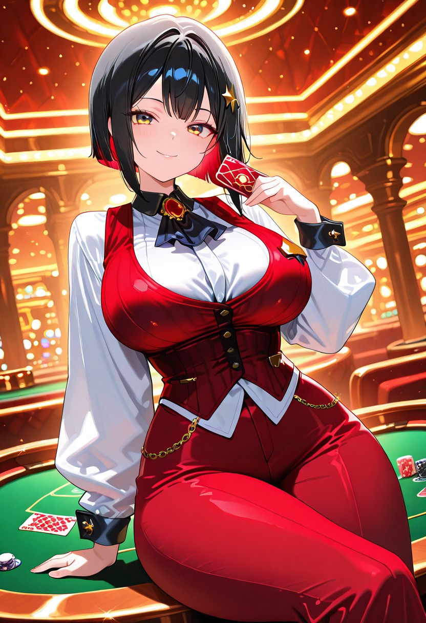 默认面部:rouge01,1个女孩,单人,短鲍伯头,黑发,红色发梢内衬,光泽发质,侧刘海,星形发夹,金色眼睛,小鼻子,清晰的下颌线,白皙皮肤,纤细腰身,宽臀