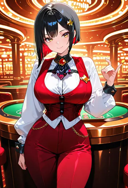 兔女郎服装:兔女郎装束,黑色亮面连体衣,深V胸开口,大型红色蝴蝶结配宝石,白色袖口,开放式白色夹克带兔图案,红色乳胶长裤,白色高跟鞋,兔耳发带,左乳覆盖黑色心形乳贴,右乳覆盖黑色黑桃形乳贴,裆部贴有红色心形贴纸