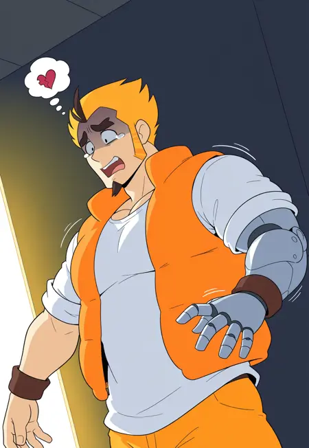 orange pants, brown wristbands, white T-shirt with the sleeves rolled up, sneakers, puffy orange vest,