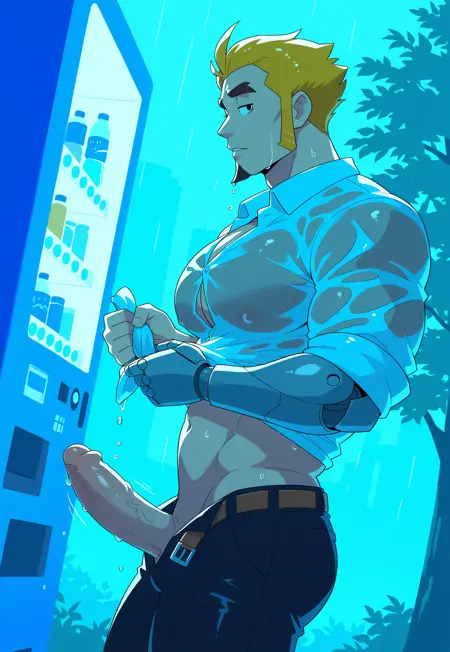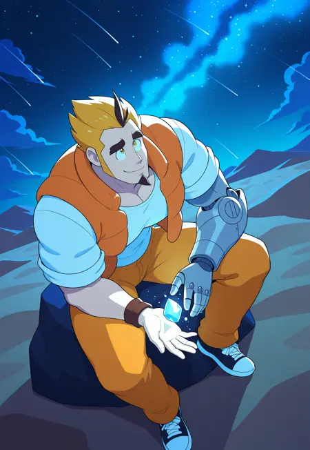 Arthur, male, brown eye color, bright yellow hair, A lock of black hair, thick eyebrows, stylized spiky and layered, facial hair, goatee, light gray mechanical arm,