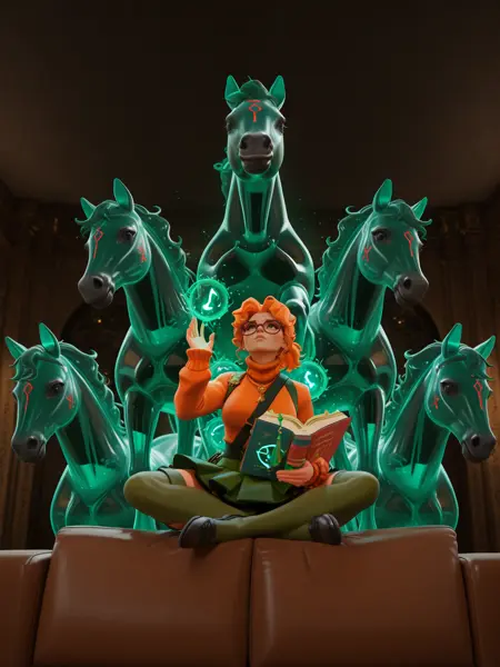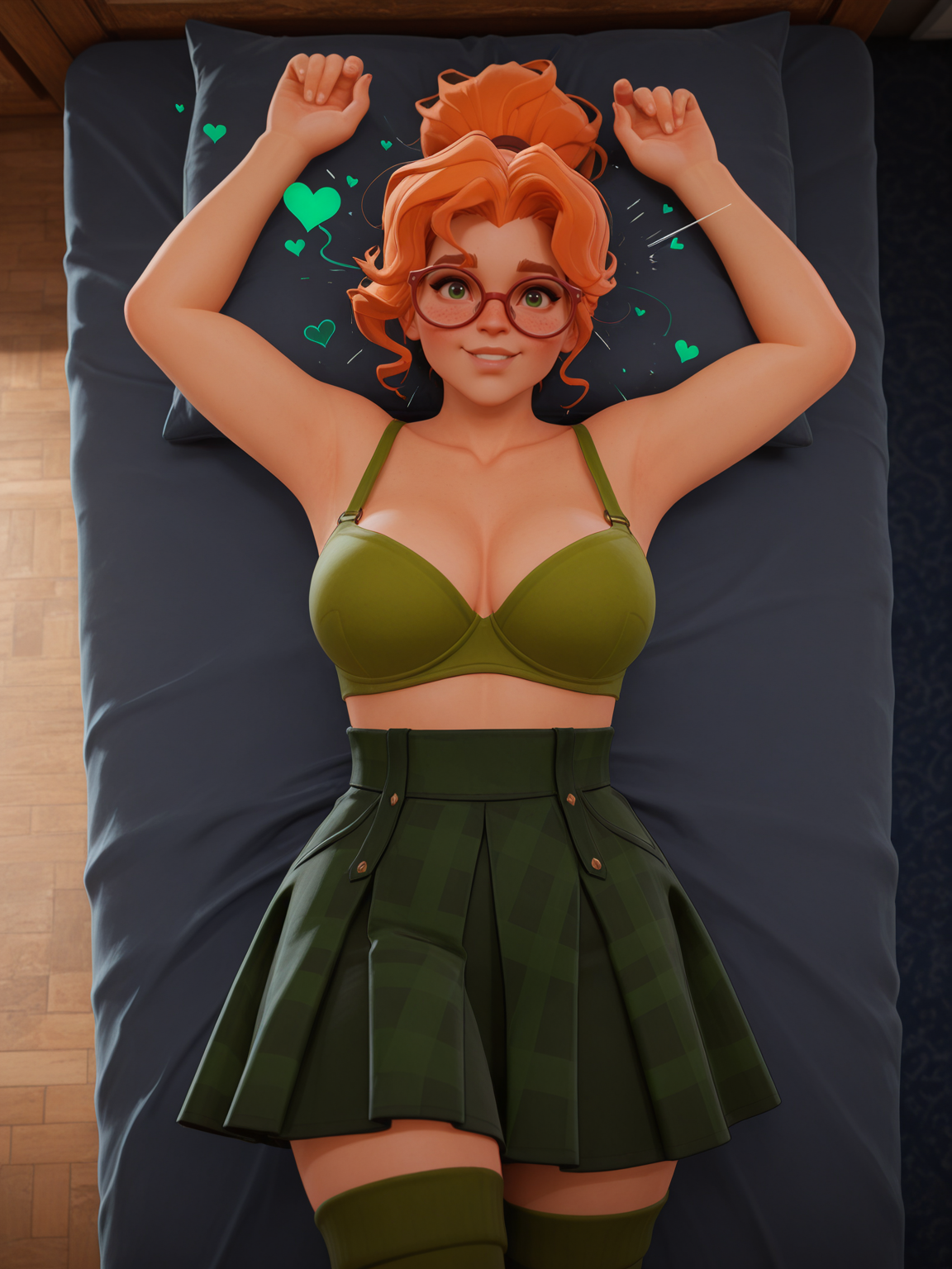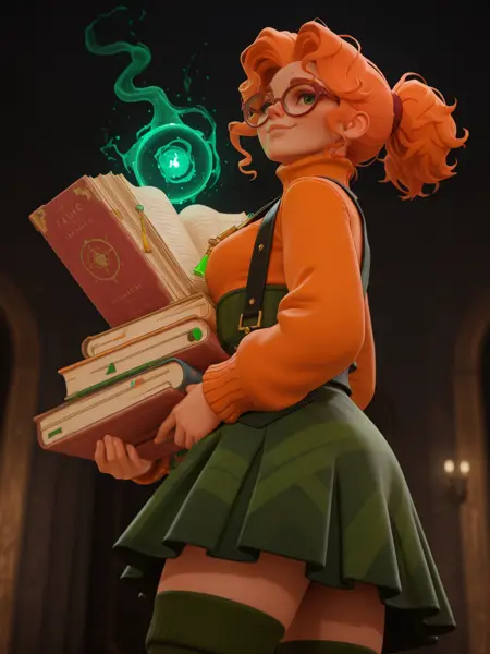 | 학습된 단어 | 1 short girl, Paige, <lora:Paige:0.9>, dark-green eyes, ponytail, (curvy body:0.6), orange hair, short hair, glasses, jewerly, green skirt, thighhighs, zettai ryouiki,turtleneck, orange sweater,shoulder strap, holding books, stack of books,복사됨! |