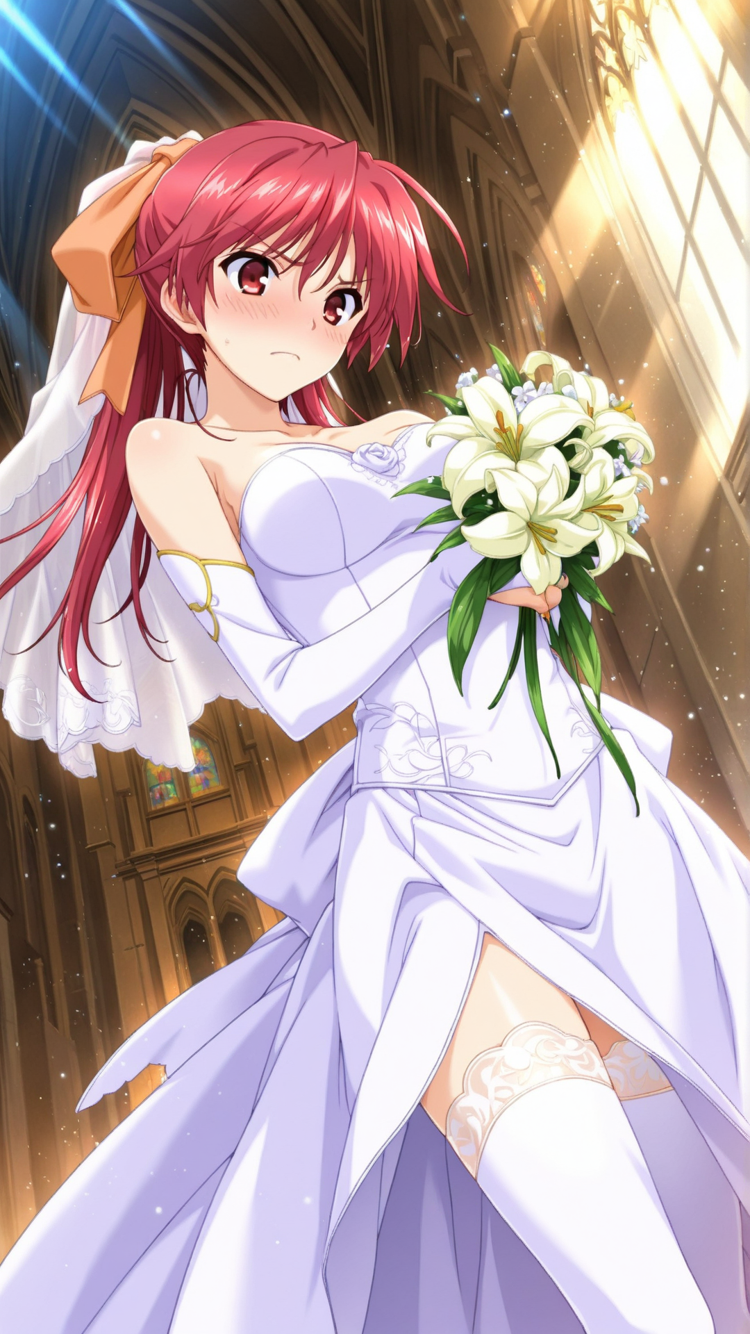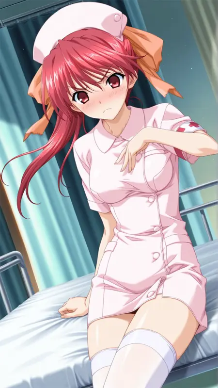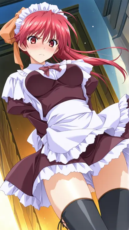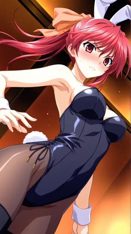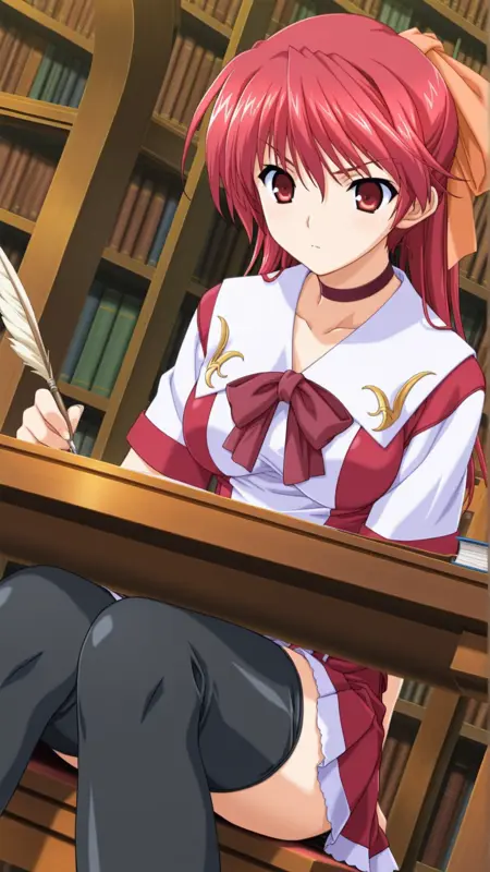 Appearance:red hair, long hair, red eyes, medium breasts, ponytail,thighhighs, hair ribbon, hair bow,