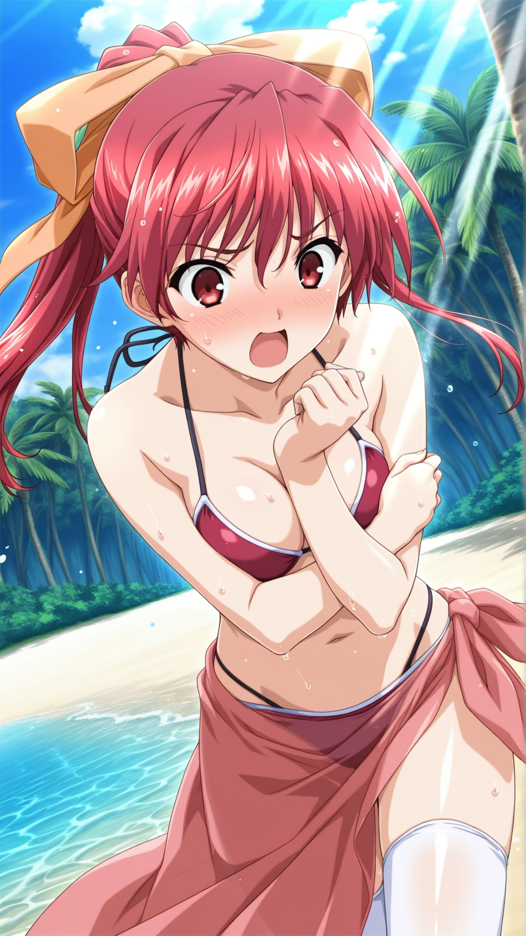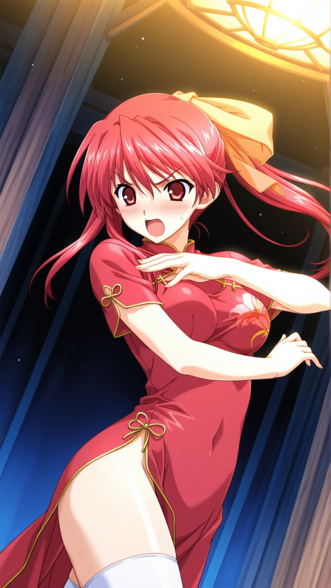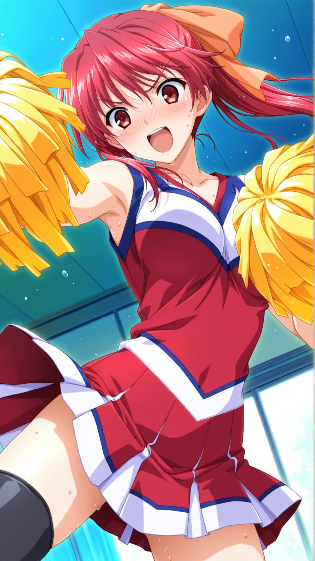 Appearance:red hair, long hair, red eyes, medium breasts, ponytail,thighhighs, hair ribbon, hair bow,