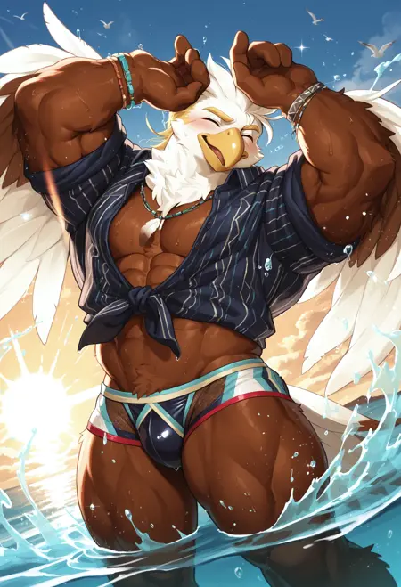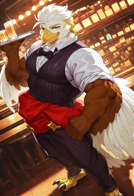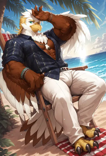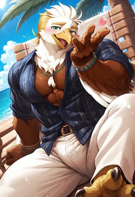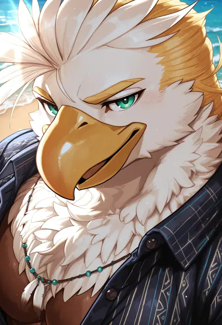 bird, bird boy, beak, feathers, brown feathers, white feathers, yellow hair, green eyes, thick eyebrows, bird tail, talons, wings, muscular male