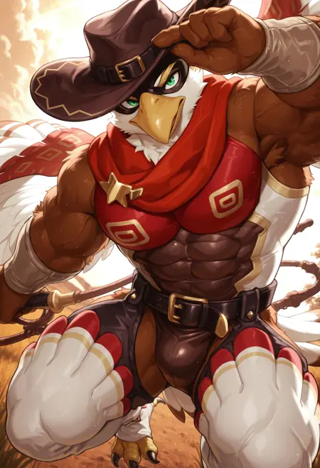 cowboy hat, domino mask, red scarf, sleeveless, leotard, covered abs, belt, chaps, crotchless pants, bracer