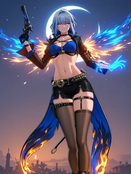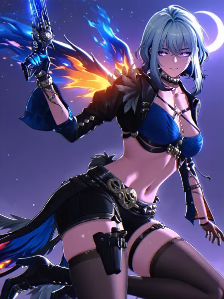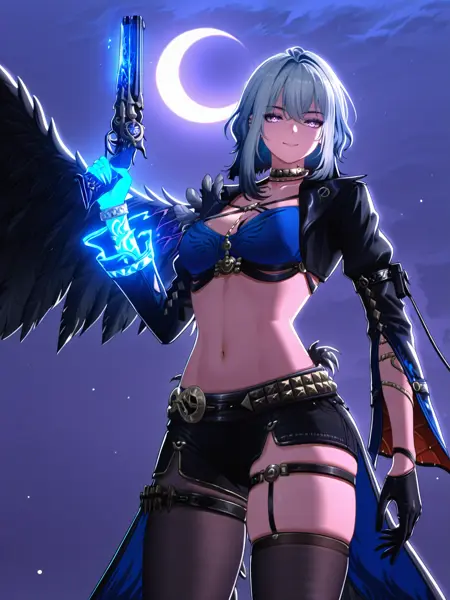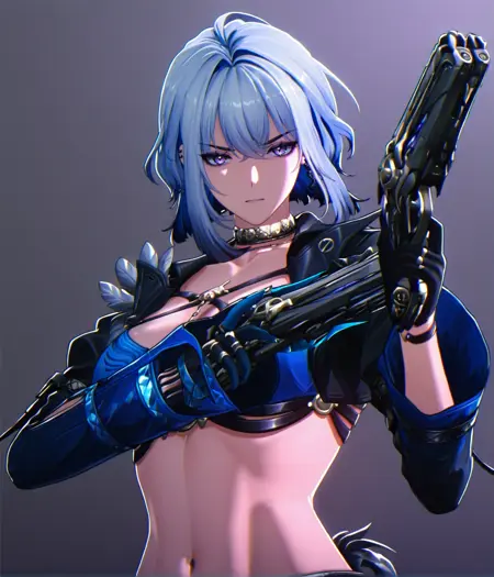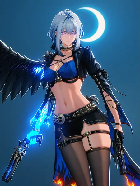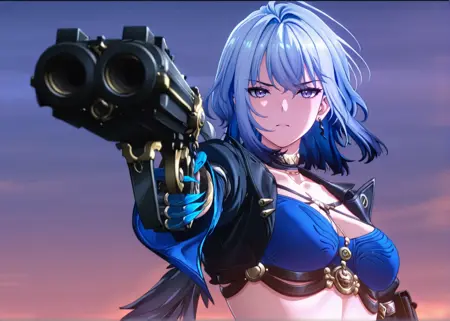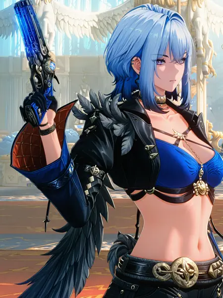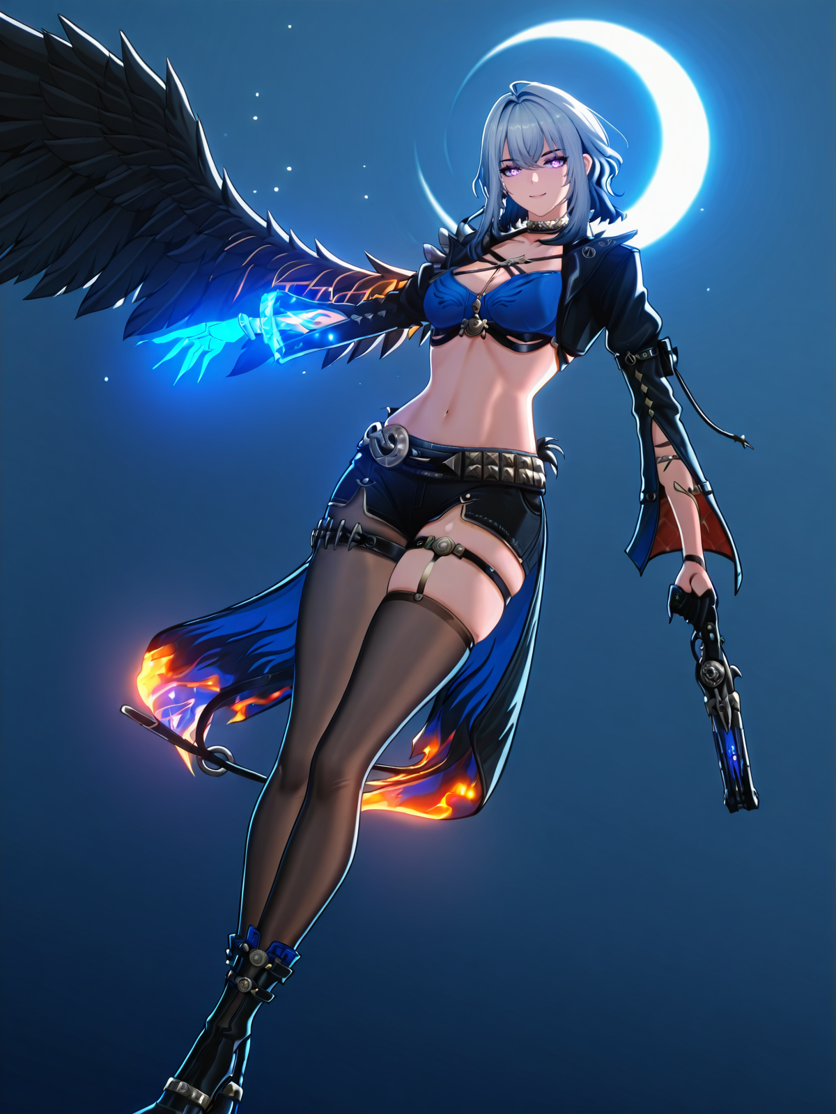 | 학습된 단어 | GalbrenaV2, 1girl, solo, grey hair, blue hair, multicolor hair,복사됨! navel, medium breasts, black gloves, black thighhighs, black footwear, short shorts, thigh strap, black choker, black shorts, chain, garter straps, claws, buckle, cropped jacket, single glove, belt buckle, black collar, asymmetrical clothes, blue bra, asymmetrical gloves, asymmetrical sleeves, single sleeve, uneven sleeves, cleavage, black jacket, black pants, asymmetrical legwear, brown thighhighs, uneven legwear,복사됨! wings, fiery wings, glowing wings, blue wings, energy wings,복사됨! gun, holding gun, weapon, holding weapon,복사됨! |