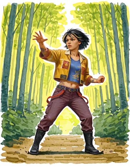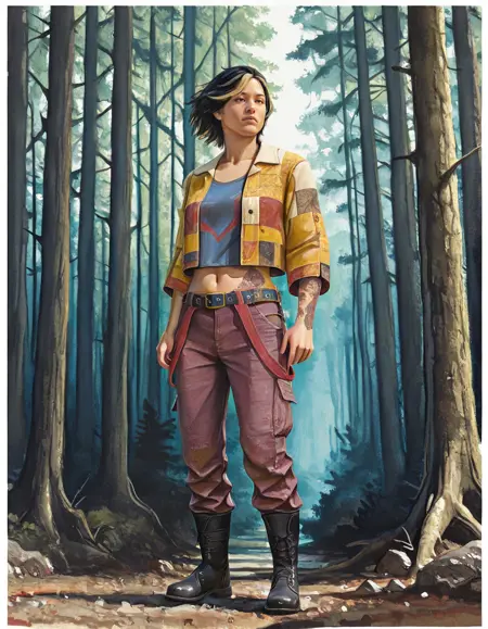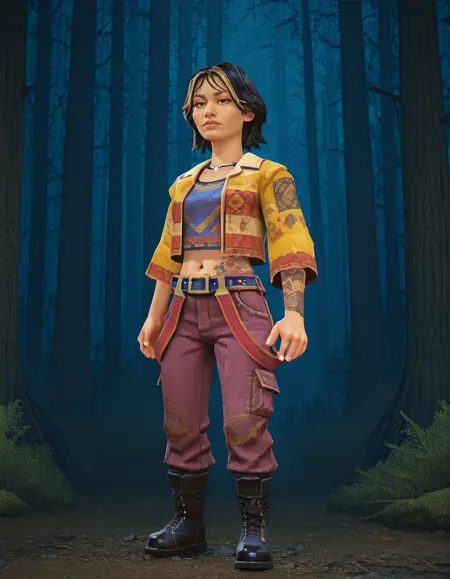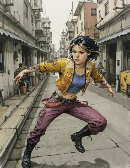 1girl, asian, boots, pants, navel, belt, black hair, midriff, jacket, shirt, arm tattoo, stomach tattoo, yellow jacket, short hair, multicolored hair, black footwear, vee boonyasak,