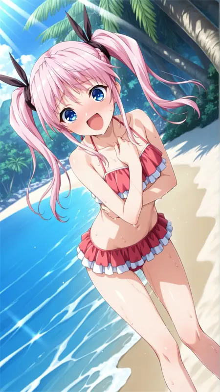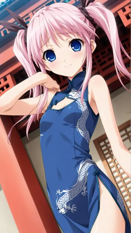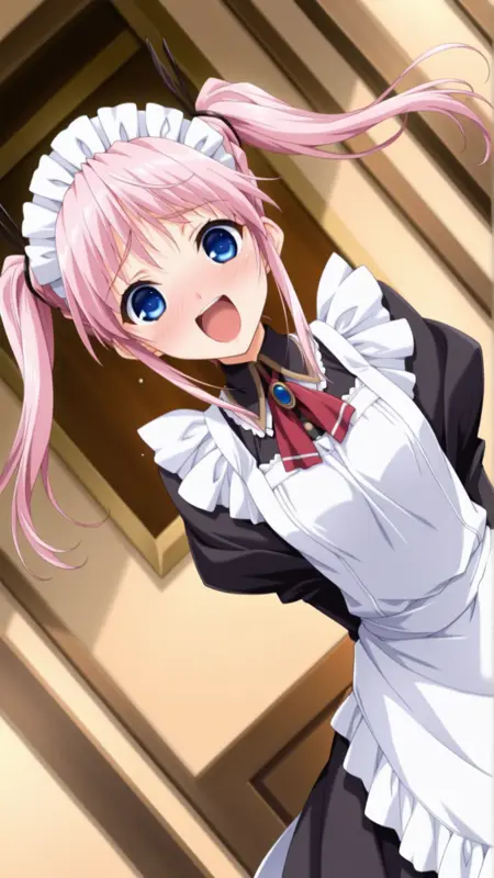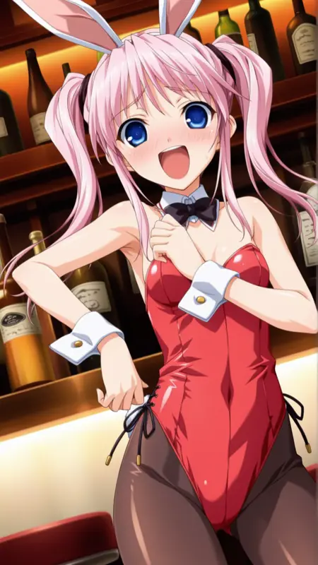 복장2: 더블 테일, 팬티스타킹, 분홍 치마, 흰 셔츠, 망토, 검은 머리 리본, 벨트,