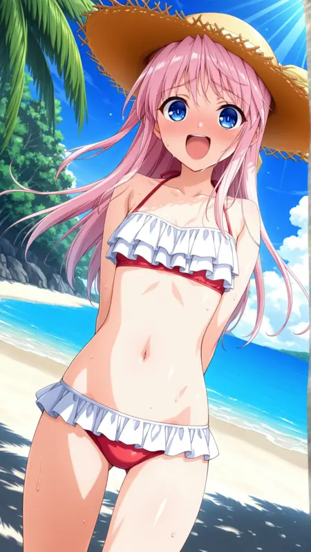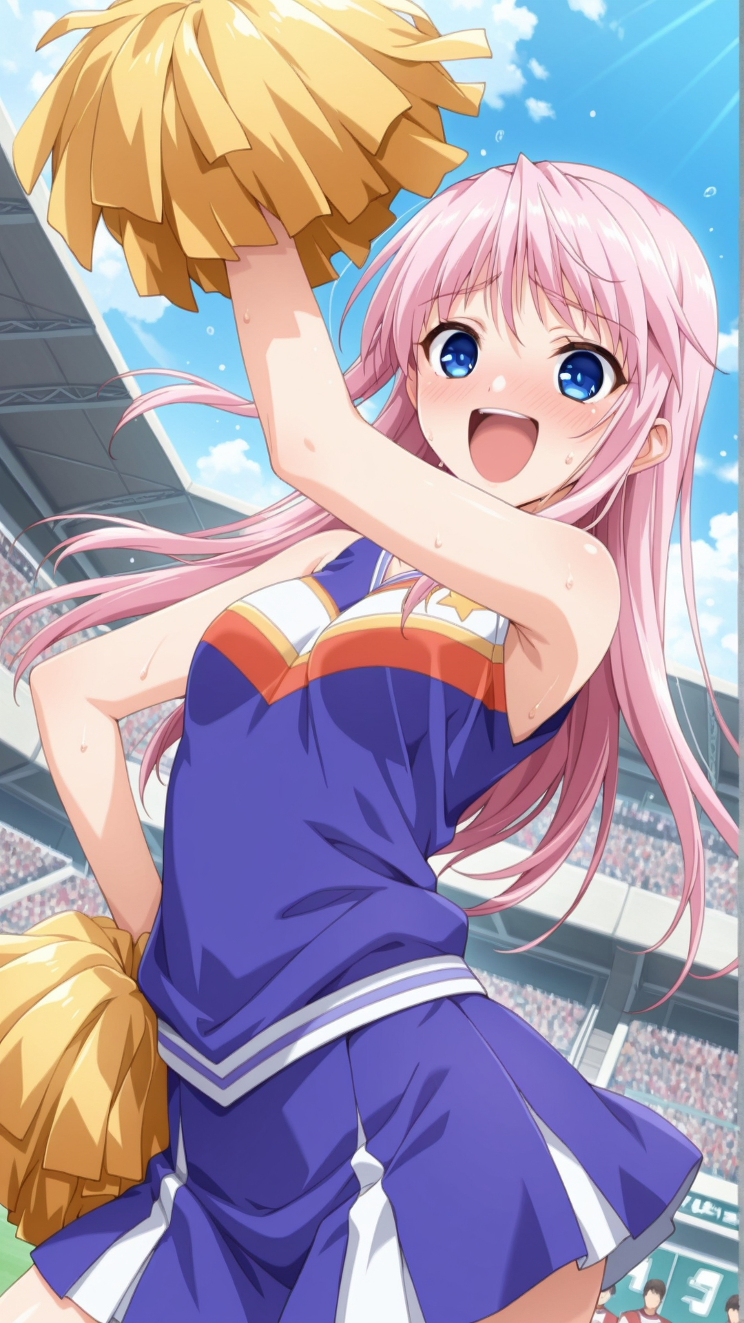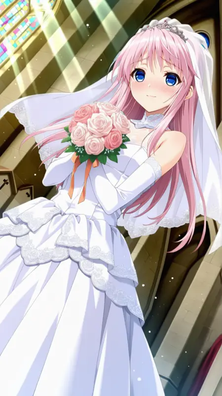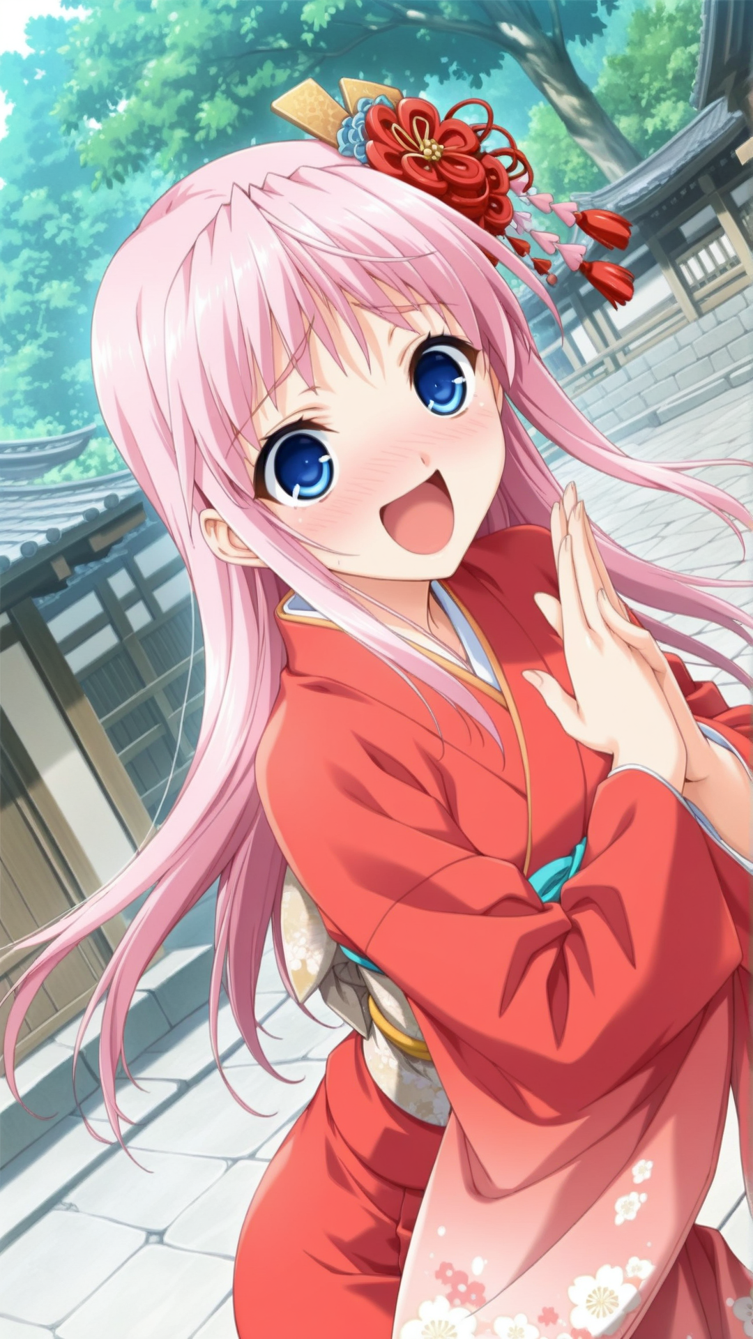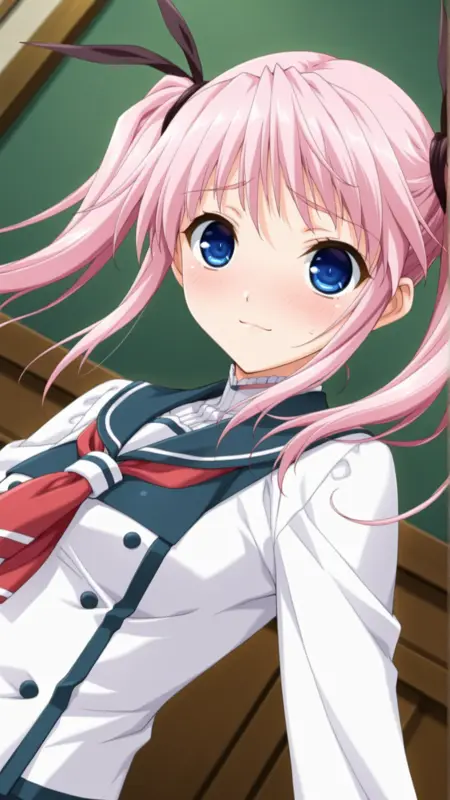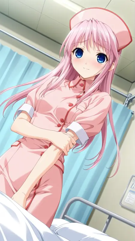 외모: 분홍색 머리, 긴 머리, 파란 눈,