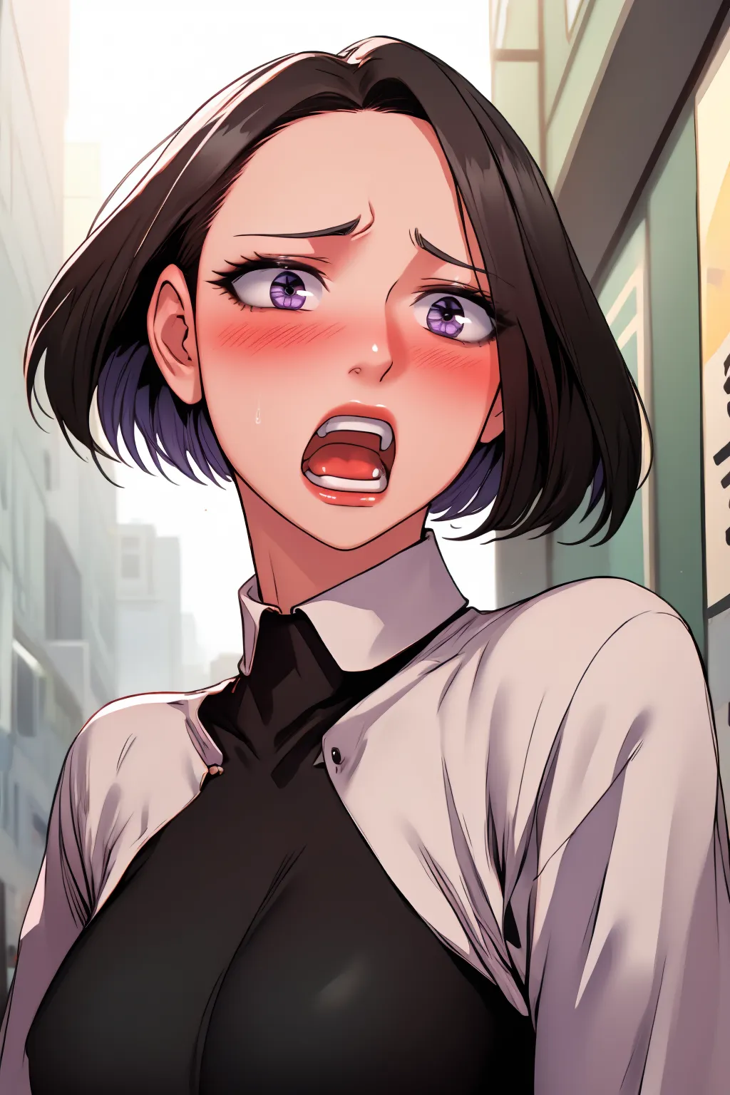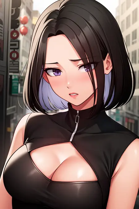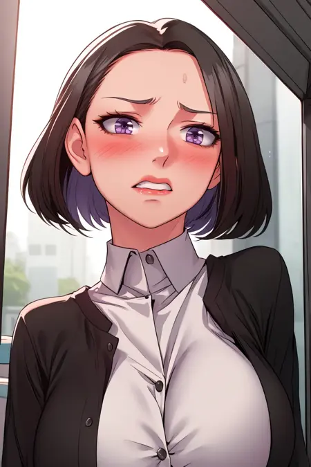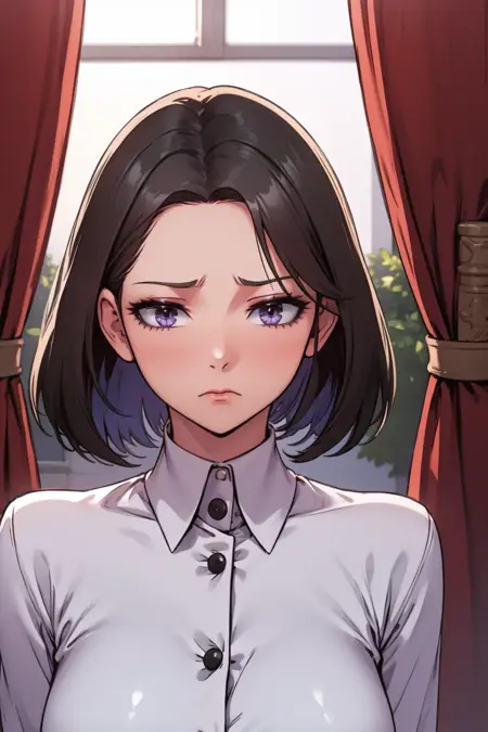 黑发,紫眼,脸红,成熟女性,1girl,刘海,大乳房