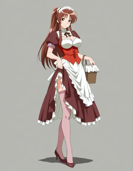 mai_npmaid,mature_female,long_hair,ponytail,brown_hair,brown_eyes,maid,long_dress,hair_ribbon,corset,maid_apron,holding_basket,pink_thighhighs